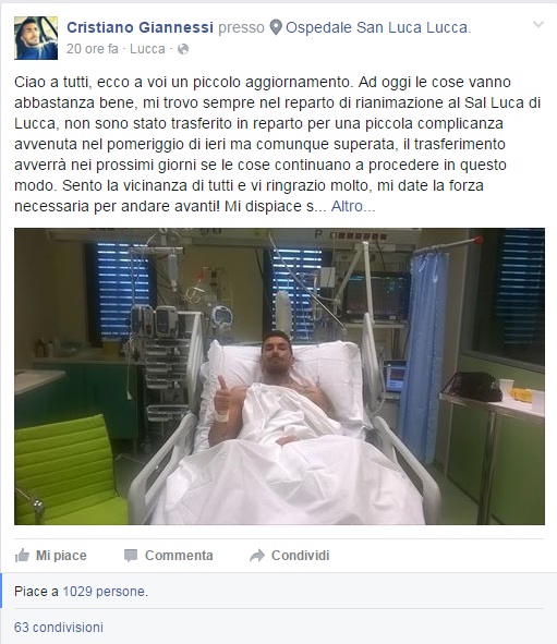 “Ciao a tutti, ecco a voi un piccolo aggiornamento. Ad oggi le cose vanno abbastanza bene, mi trovo sempre nel reparto di rianimazione al Sal Luca di Lucca, non sono stato trasferito in reparto per una piccola complicanza avvenuta nel pomeriggio di ieri ma comunque superata, il trasferimento avverrà nei prossimi giorni se le cose continuano a procedere in questo modo. Sento la vicinanza di tutti e vi ringrazio molto, mi date la forza necessaria per andare avanti!