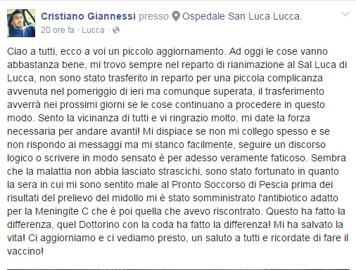 LUCCA – Cristiano Giannessi ha 33 anni e si è risvegliato dal coma in cui era entrato il 14 gennaio scorso per una meningite. Il 22 gennaio il giovane si è connesso a Facebook, subito dopo il risveglio, per lanciare un appello: “Vaccinatevi“. Giannessi, originario di Chiesina Uzzanese in provincia di Pistoia, ha deciso di raccontare la sua esperienza e di consigliare agli altri di fare il vaccino e di non rischiare, perché “questa malattia è bastarda e io sono stato fortunato”.