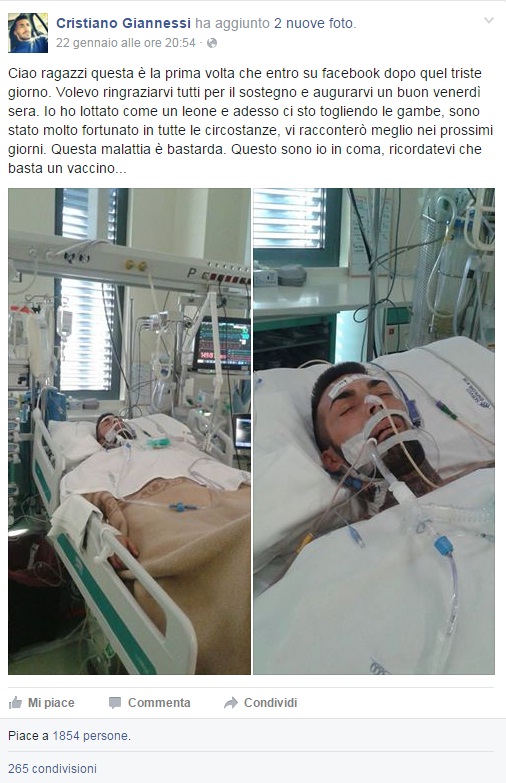 “Ciao ragazzi questa è la prima volta che entro su facebook dopo quel triste giorno. Volevo ringraziarvi tutti per il sostegno e augurarvi un buon venerdì sera. Io ho lottato come un leone e adesso ci sto togliendo le gambe, sono stato molto fortunato in tutte le circostanze, vi racconterò meglio nei prossimi giorni. Questa malattia è bastarda. Questo sono io in coma, ricordatevi che basta un vaccino…”.