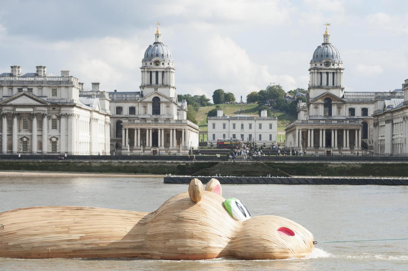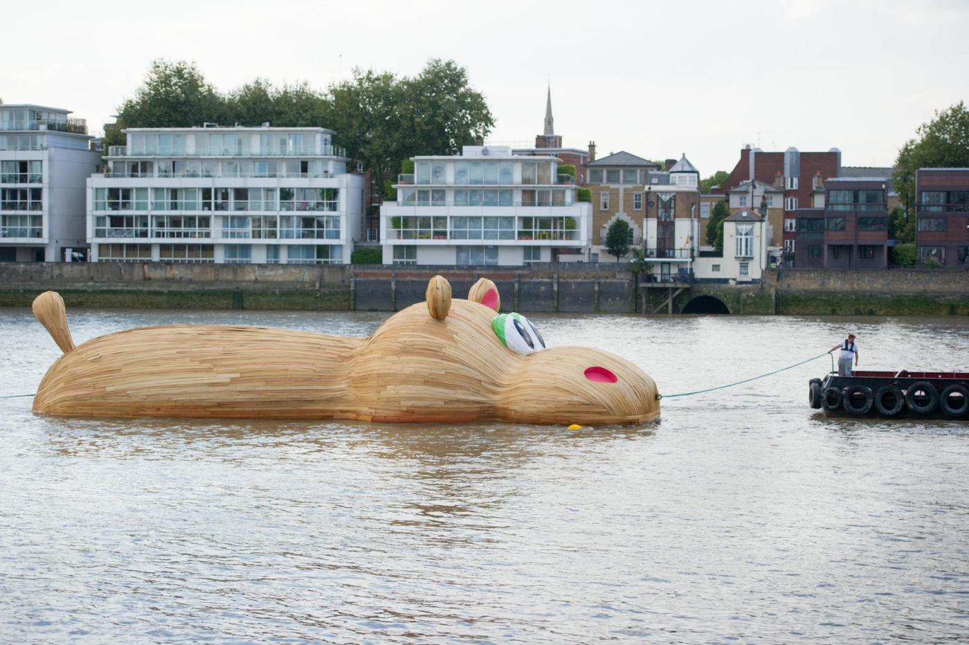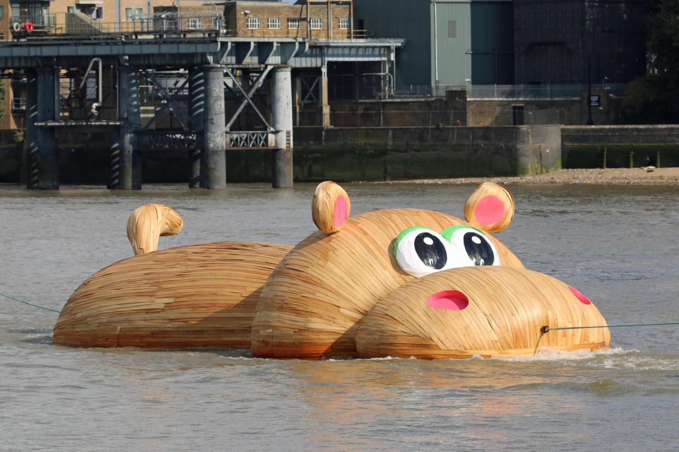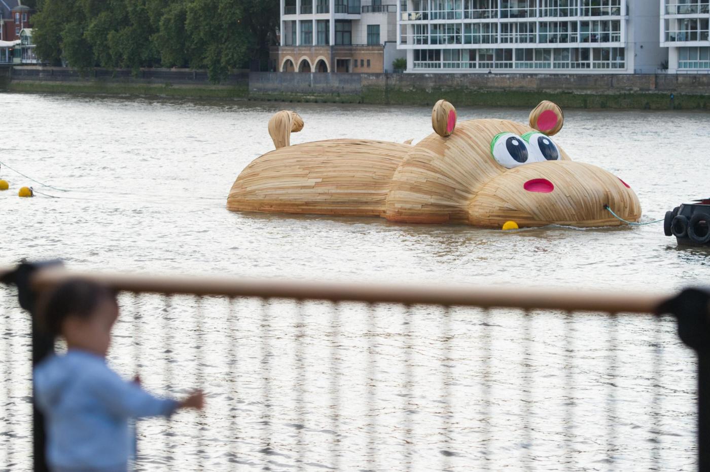 LONDRA – Lo scultore olandese Florentijn Hofman è in piena attività in questi giorni: dopo aver istallato un coniglio gigante sdraiato a Taiwan, ha realizzato un mega ippopotamo di legno sul Tamigi.