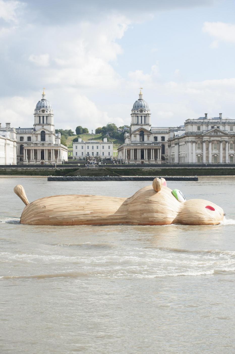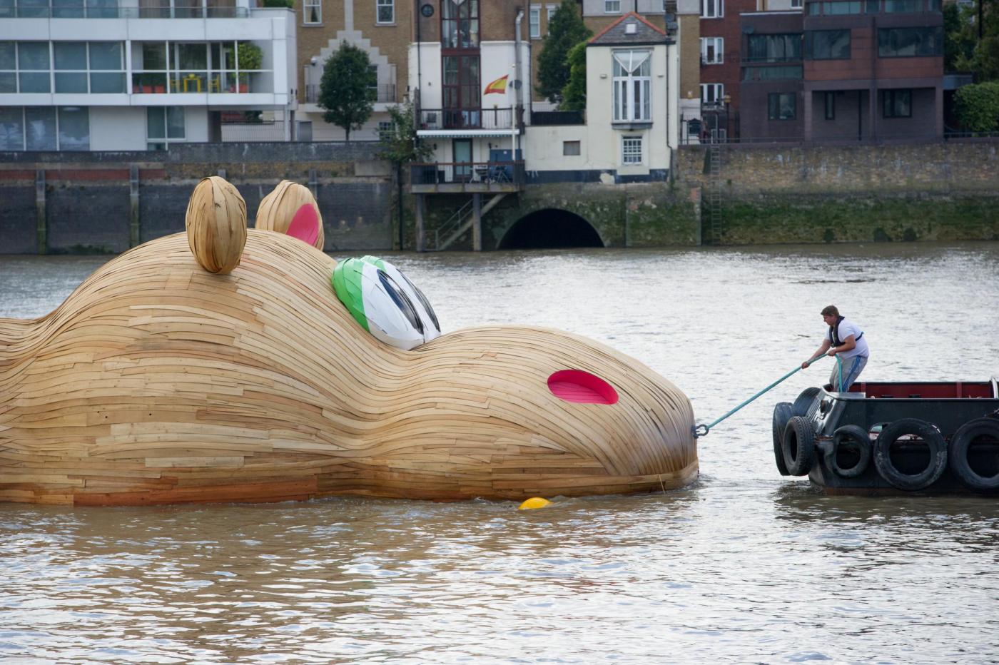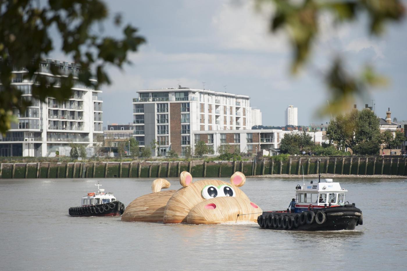 LONDRA – Lo scultore olandese Florentijn Hofman è in piena attività in questi giorni: dopo aver istallato un coniglio gigante sdraiato a Taiwan, ha realizzato un mega ippopotamo di legno sul Tamigi.
