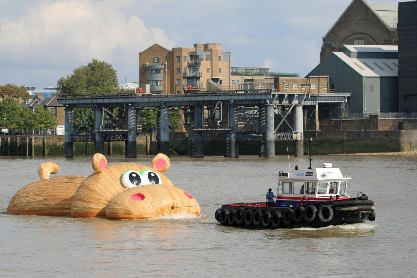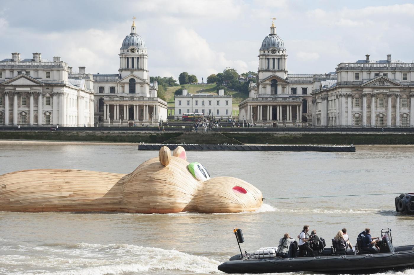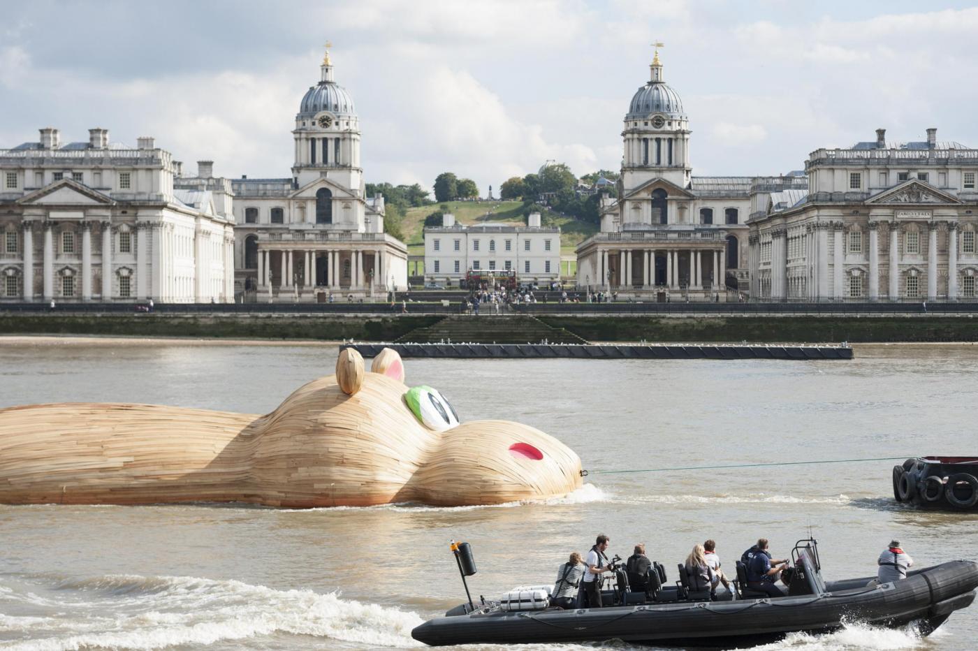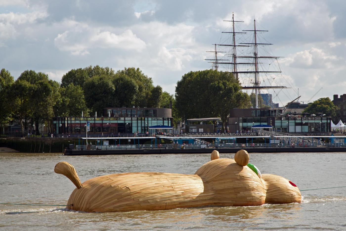 LONDRA – Lo scultore olandese Florentijn Hofman è in piena attività in questi giorni: dopo aver istallato un coniglio gigante sdraiato a Taiwan, ha realizzato un mega ippopotamo di legno sul Tamigi.