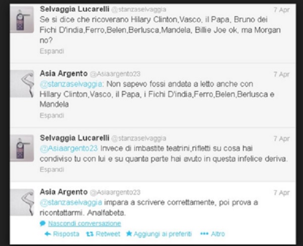 ROMA – Selvaggia Lucarelli contro Asia Argento: una guerra iniziata nel lontano 2013 a causa di…Morgan. Mentre la blogger e l’attrice se le stanno continuando a dire su Twitter dopo la lite a Ballando con le Stelle, il sito, Ultime Notizie Flash, ricorda che anni fa le due avevano già avuto un interminabile botta e risposta social. Il tutto nasce con il ricovero di Morgan.