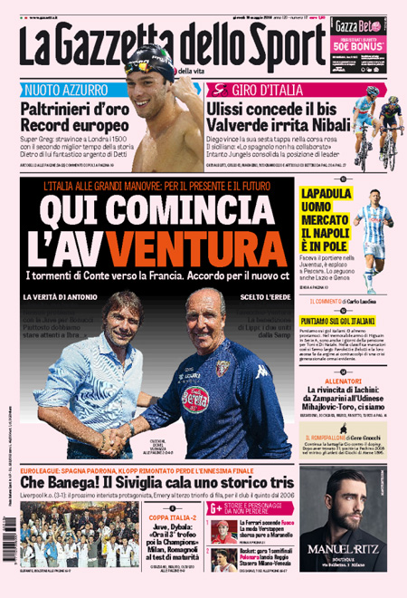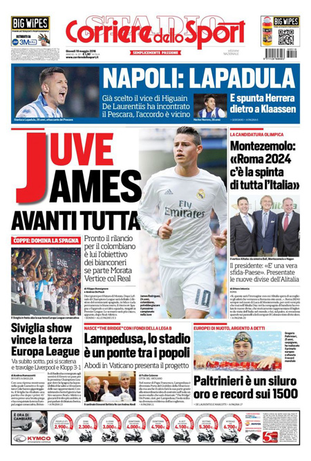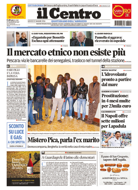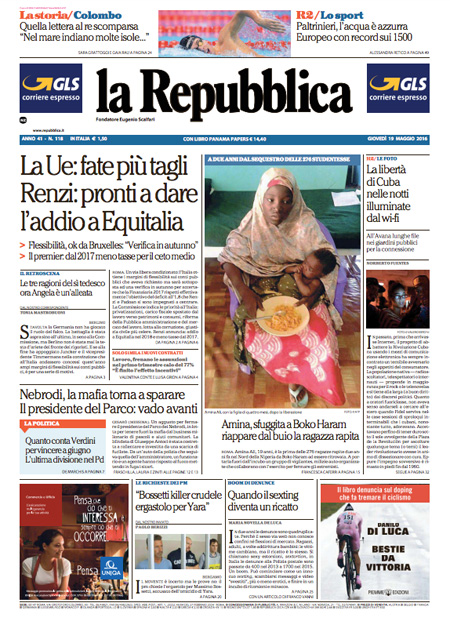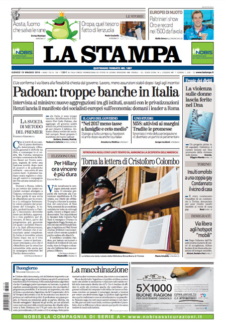 ROMA – Queste le prime pagine dei giornali di giovedรฌ 19 maggio. La prima pagina della Stampa: “Padoan: troppe banche in Italia”. La prima pagina del Corriere della Sera: “Le condizioni Ue: verifica a ottobre sui conti italiani”. La prima pagina de La Repubblica: “La Ue: fate piรน tagli. Renzi: pronti a dare l’addio a Equitalia”. La prima pagina del Sole 24 Ore: “Ue: sรฌ alla flessibilitร , ma bis”.
