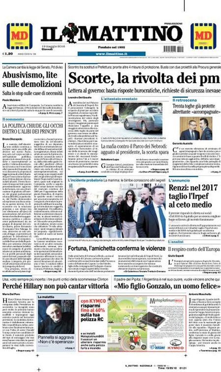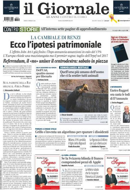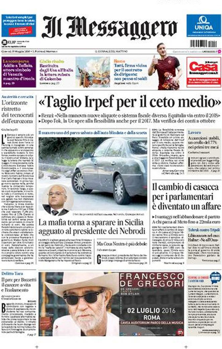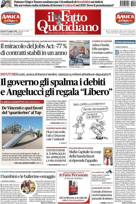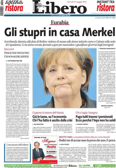 La prima pagina del Messaggero: “Taglio Irpef per il ceto medio”. La prima pagina del Giornale: “Ecco l’ipotesi patrimoniale”. La prima pagina di Libero: “Gli stupri in casa Merkel”. La prima pagina del Fatto Quotidiano: “Il governo gli spalma i debiti e Angelucci gli regala Libero”.ย Queste le prime pagine dei giornali di giovedรฌ 19 maggio.