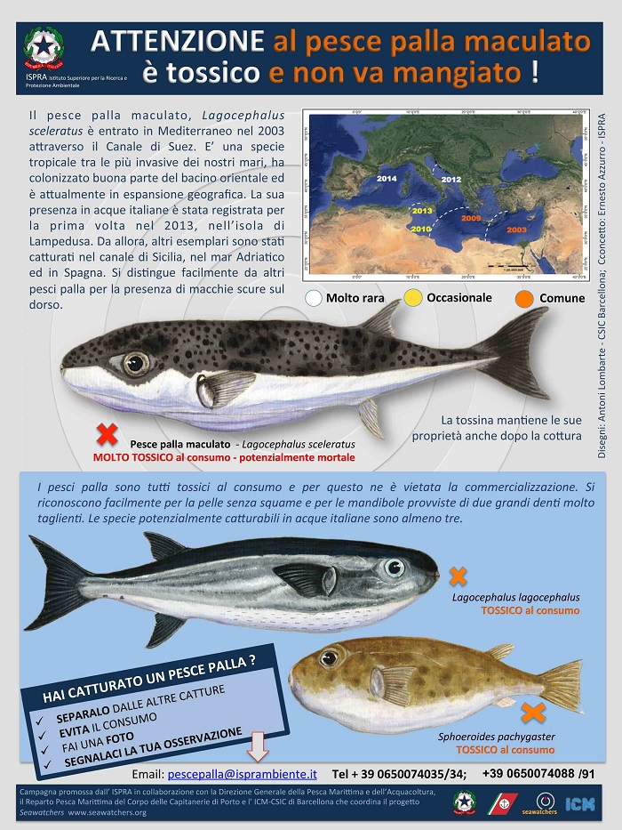 Il pesce palla maculato, segnalato per la prima volta nelle coste italiane nel settembre 2013, all’interno dell’Area Marina Protetta delle Isole Pelagie, continua ad espandere la sua distribuzione geografica nel mar Mediterraneo. Le sue carni sono altamente tossiche, anche dopo la cottura. Grazie alla campagna di informazione dell’Ispra (Istituto per la protezione e la ricerca ambientale), lanciata nel dicembre 2015 in collaborazione con il Reparto Pesca Marittima del Corpo delle Capitanerie di Porto – ricorda una nota – è stato possibile reperire nuove segnalazioni da regioni come Sicilia, Calabria e Puglia. La legge italiana vieta la commercializzazione di tutti i pesci palla. È importante sapere che la tossicità del pesce palla maculato permane anche dopo la cottura; una volta catturato, bisogna stare attenti a maneggiarlo per evitarne il potente morso, per il resto toccarlo non comporta altri rischi ed il semplice il contatto con altre specie non mette a rischio contaminazione il pescato.