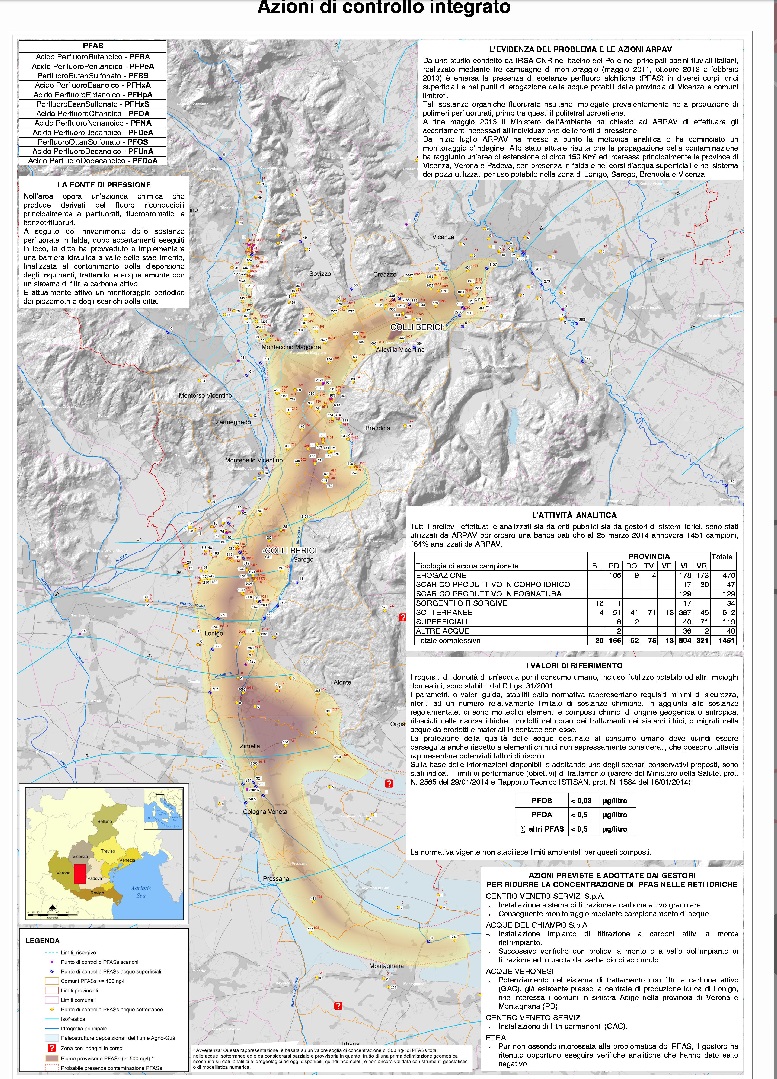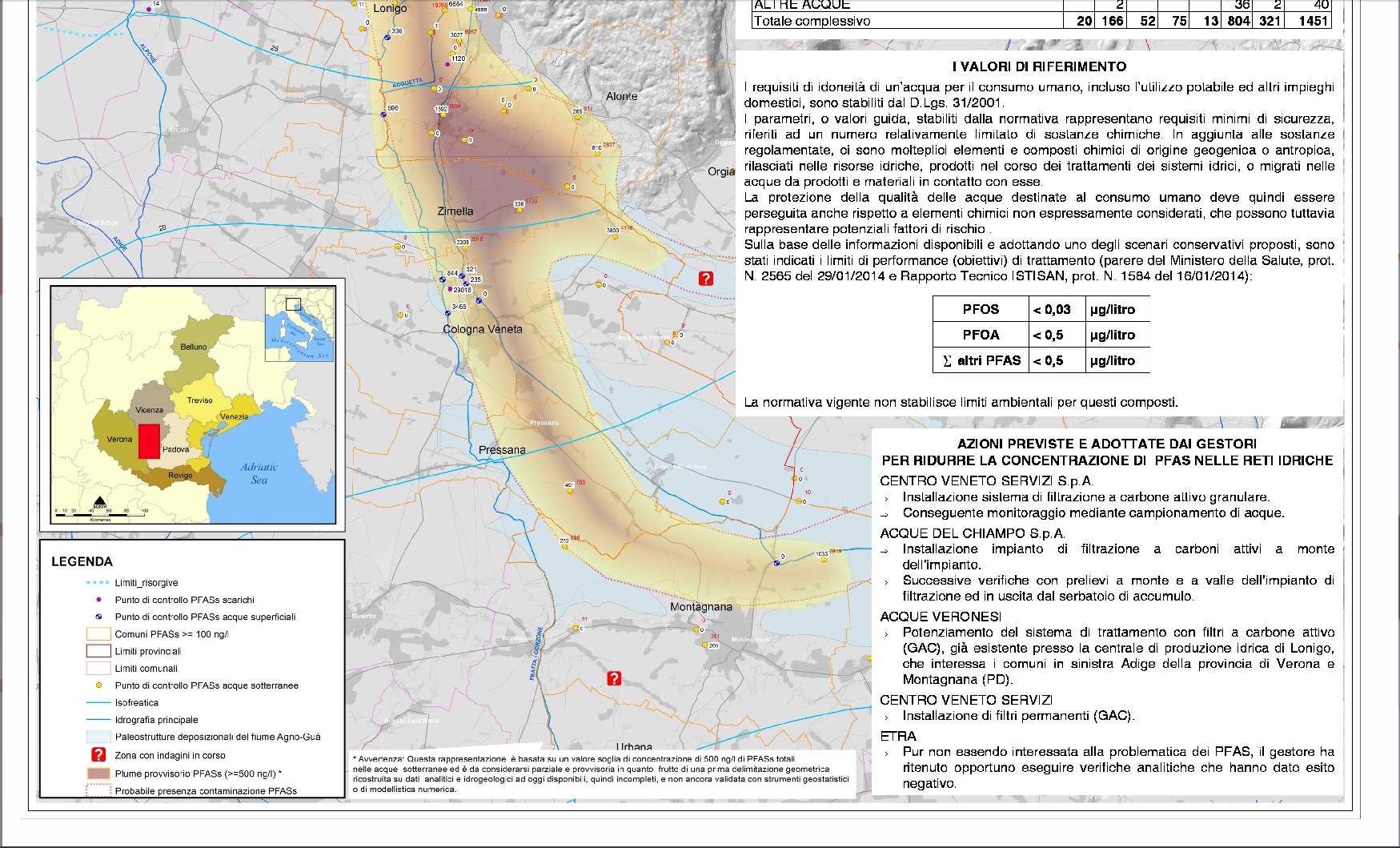 L’Arpa, l’Agenzia regionale per l’ambiente, dopo una campagna di monitoraggio delle acque ha certificato, sempre nel 2013, che dallo scarico dell’azienda Miteni sono fuoriusciti per vent’anni “notevoli quantità di perfluoroalchilati” e “gli impianti di depurazione non sono stati in grado di abbattere questo tipo di sostanze”. La Regione Veneto ha imposto l’uso di appositi filtri e richiesto aiuto al governo per le spese necessarie per mettere in sicurezza l’acquedotto: servono cento milioni di euro l’anno.