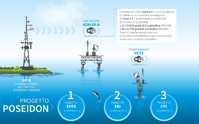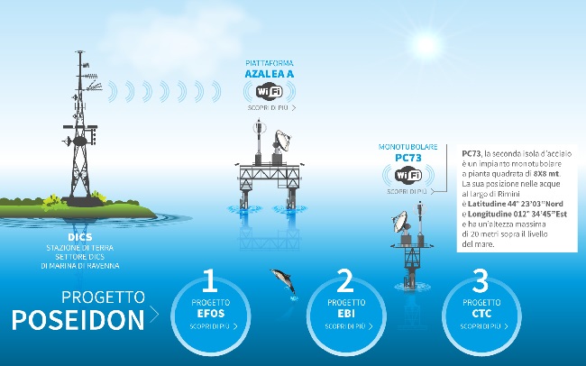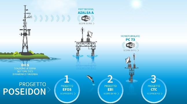 Tornando nel Mare nostrum, Poseidon si articola in tre sottoprogetti tra di loro correlati: EFOS, EBI e CTC dedicati rispettivamente alle piattaforme che verranno attrezzate per diventare stazioni di trasmissione di segnali, al monitoraggio della flora marina in transito attraverso sistemi sonar, alla raccolta e allo studio dei segnali inviati dagli animali portatori di ricetrasmittenti.