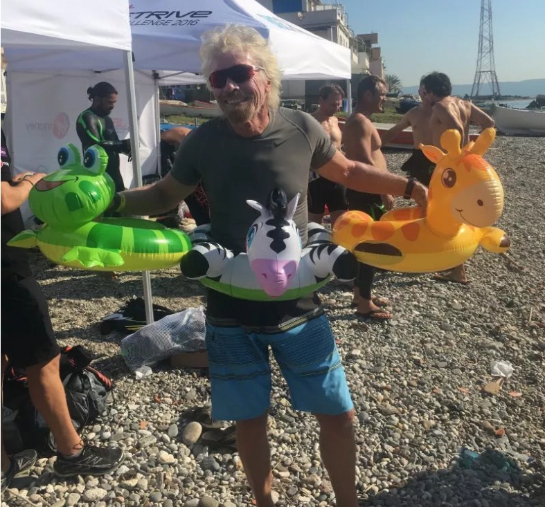 Si chiama Virgin Strive Challenge ed è una sfida rivolta a tutta l’Italia il cui scopo è attirare l’attenzione su questioni ambientali. Lo scorso 8 giugno, Giornata Mondiale degli Oceani, Branson ha lanciato il guanto di sfida all’amico Grenier, attore del Diavolo veste Prada. E quello ha non ci ha pensato due volte: insieme hanno percorso a nuoto i 3,3 km che separano la Calabria dalla Sicilia.