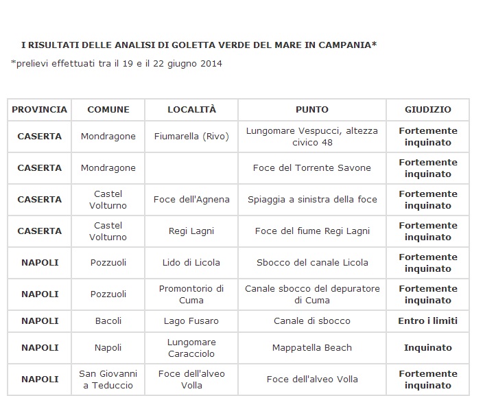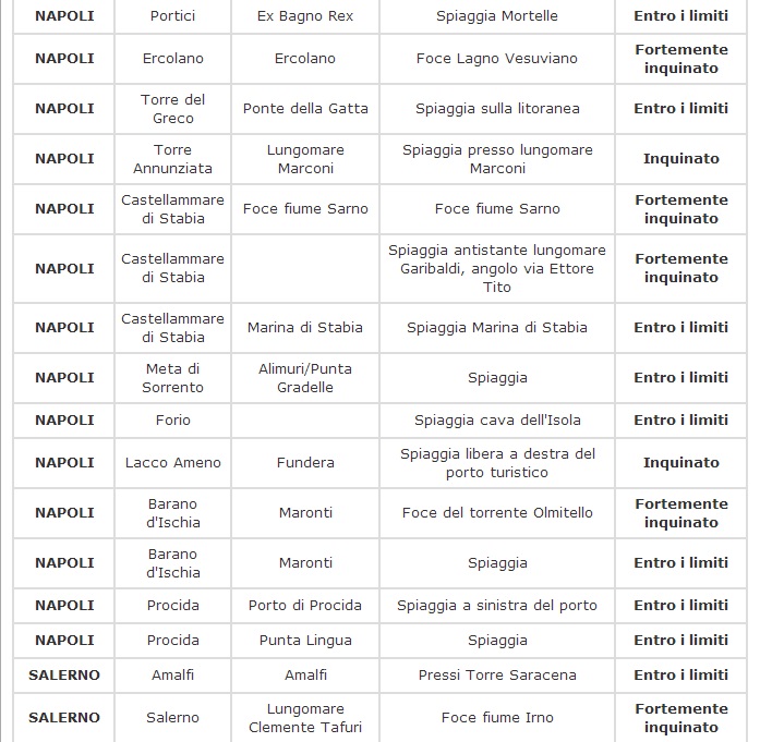 Nello specifico sono stati riscontrati fortemente inquinanti i prelievi d’acqua effettuati a Pozzuoli (sia allo sbocco del canale di Licola sia canale di sbocco del depuratore di Cuma); a San Giovanni a Teduccio (foce dell’Alveo Volla); a Ercolano (foce lagno Vesuviano); in due tre punti di Castellammare di Stabia (alla foce del fiume Sarno e alla spiaggia antistante il lungomare Garibaldi – angolo via Ettore Tito) e a Barano d’Ischia (alla foce del Torrente Olmitello). Sono state giudicate “inquinate”, invece, le acque prelevate a Napoli (Mappatella Beach sul Lungomare Caracciolo); a Torre Annunziata (spiaggia presso Lungomare Marconi) e a Lacco Ameno (spiaggia libera a destra del porto in località Fundera). Entro i limiti di legge, invece, gli inquinanti riscontrati a Bacoli (canale di sbocco Lago Fusaro); a Torre del Greco (spiaggia sulla litoranea, in località Ponte della Gatta); a Portici (spiaggia Mortelle, località ex Bagno Rex); nell’altro punto monitorato a Castellammare di Stabia (spiaggia Marina di Stabia); a Meta di Sorrento (spiaggia in località Alimuri/Punta Gradelle).