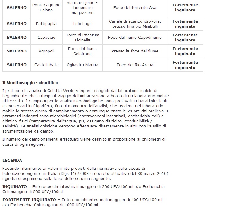 Cariche batteriche ben oltre il consentito quelle riscontrate nella città capoluogo (spiaggia antistante via Mantegna sul Lungomare Marconi e alla foce del fiume Irno sul Lungomare Marconi); a Pontecagnano Faiano (Foce del torrente Asa, in via Mare Jonio – lungomare Magazzeno); a Battipaglia (canale di scarico idrovora, presso fine via Mimbelli in località Lido Lago); a Capaccio (foce del fiume Capodifiume, in località Torre di Paestum-Licinella); ad Agropoli (presso la foce del fiume Solofrone); a Castellabate (foce del rio Arena di Ogliastra Marina). Unico punto nella norma quello nei pressi della Torre Saracena di Amalfi.