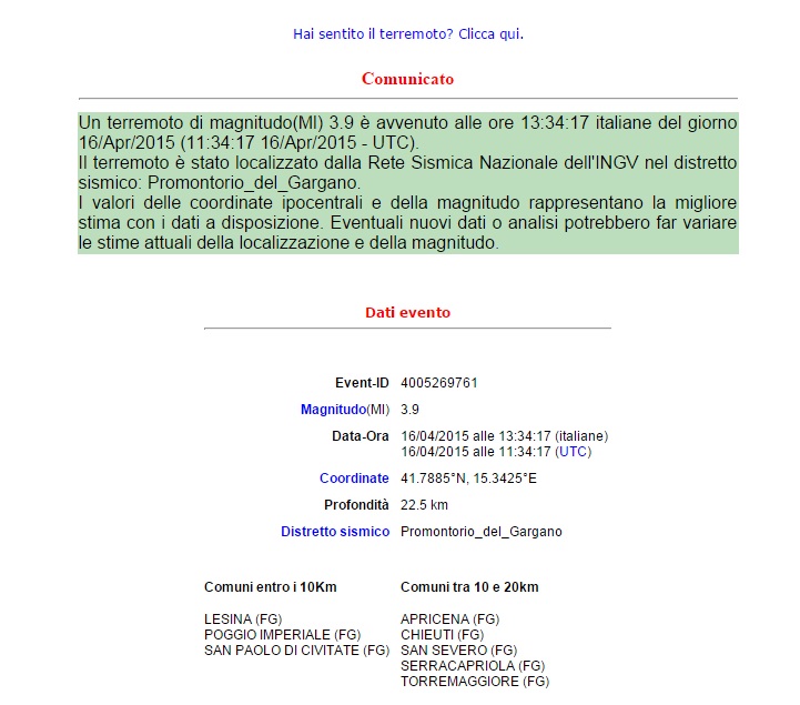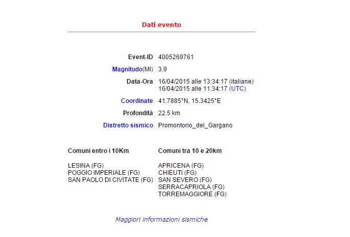 BARI – Terremoto in provincia di Foggia: una scossa di magnitudo 3.9 รจ stata registrata alle ore 13.34 di giovedรฌ 16 aprile nel distretto sismico del Promontorio del Gargano. L’epicentro – segnala l’Istituto nazionale di Geofisica e Vulcanologia (Ingv) – รจ stato localizzato tra i Comuni di Lesina, Poggio Imperiale e San Paolo di Civitate (Foggia).