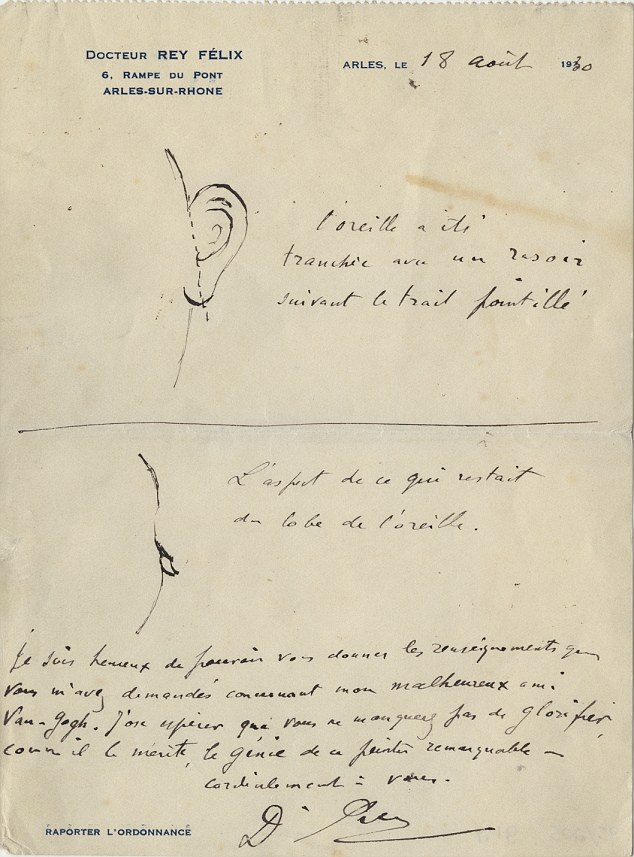 Grazie a delle recenti scoperte, è venuta alla luce la versione reale della storia, conservata nel taccuino di un medico francese che aveva minuziosamente disegnato la parte amputata del pittore. Sono stati trovati infatti i disegni del Dottor Felix Rey, il medico che trattò la ferita: un paio di righe, scritte in maniera molto comprensibile, raccontano che l’artista anziché tagliare solo il lobo, come si pensava finora, si recise tutto l’orecchio.