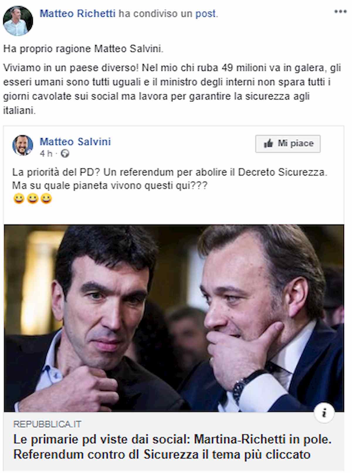 Salvini attacca Martina e Richetti, acceso il botta e risposta sui social Politica Italiana Salvini attacca Martina e Richetti, acceso il botta e risposta sui social admin Gennaio 4, 2019 Viene pubblicata l’indagine online sulle primarie del PD e Matteo Salvini non le manda a dire a...Read More