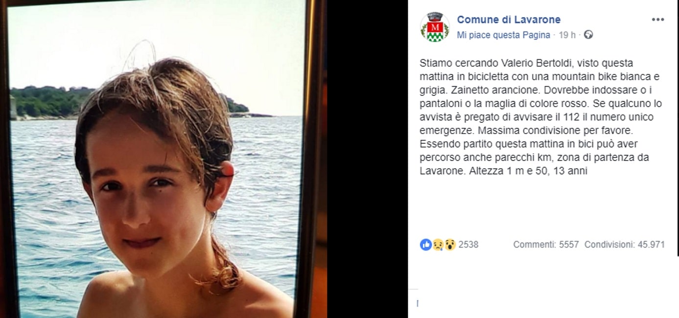 Lavarone, Valerio Bertoldi ritrovato: si era allontanato in bici per andare al mare Cronaca Italia Lavarone, Valerio Bertoldi ritrovato: si era allontanato in bici per andare al mare admin Settembre 5, 2018 TRENTO – Valerio Bertoldi, 13 anni, è scomparso dal 4 settembre da Lavarone, in provincia di Trento,...Read More