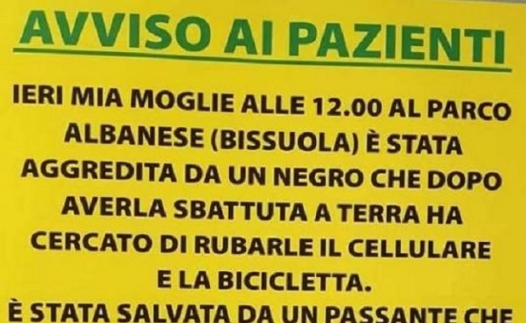 Mestre, il cartello choc dal dentista: “Mia moglie aggredita da un negro” Cronaca Italia Mestre, il cartello choc dal dentista: “Mia moglie aggredita da un negro” admin Luglio 13, 2018 VENEZIA – Un dentista ha appeso un cartello nel suo studio sostenendo che la moglie fosse stata...Read More