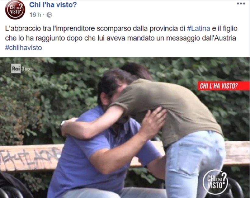 Vito Caroli, imprenditore ritrovato da Chi l’ha visto? riabbraccia il figlio Cronaca Italia Vito Caroli, imprenditore ritrovato da Chi l’ha visto? riabbraccia il figlio admin Giugno 7, 2018 ROMA – L’imprenditore Vito Caroli è stato ritrovato a 40 giorni dalla sua scomparsa e la troupe...Read More