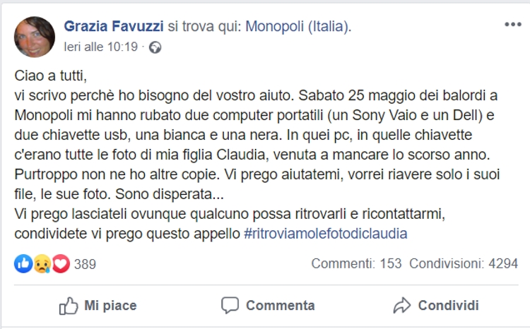 Monopoli, mamma lancia appello ai ladri del suo pc: “C’erano le foto di mia figlia morta, ridatemele” Cronaca Italia Monopoli, mamma lancia appello ai ladri del suo pc: “C’erano le foto di mia figlia morta, ridatemele” admin Maggio 30, 2019 BARI – Hanno rubato un computer, ma dentro c’erano le foto della figlia morta lo scorso anno....Read More