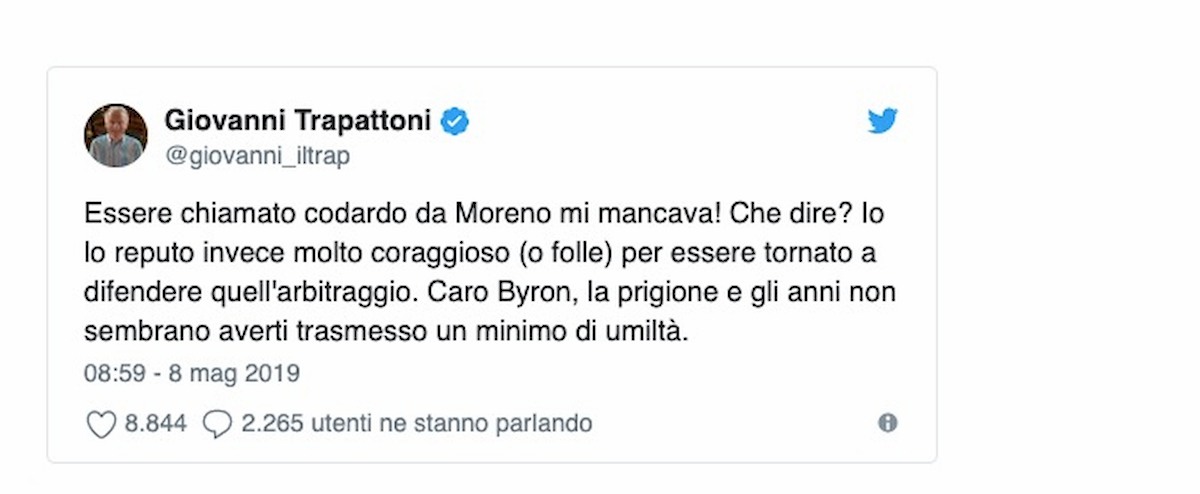 Giovanni Trapattoni risponde a Byron Moreno: “Io codardo? La prigione non gli ha insegnato nulla…” Sport Giovanni Trapattoni risponde a Byron Moreno: “Io codardo? La prigione non gli ha insegnato nulla…” admin Maggio 8, 2019 MILANO – E’ ancora Italia-Corea del Sud. Byron Moreno, arbitro che regalò alla Corea del Sud la...Read More