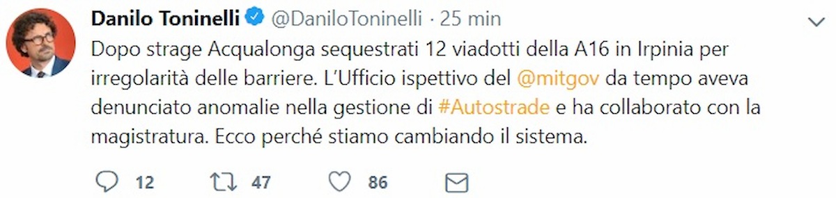 Toninelli, ennesima gaffe: “Sequestrati 12 viadotti sulla A16”. Ma sono solo le barriere… Cronaca Italia Toninelli, ennesima gaffe: “Sequestrati 12 viadotti sulla A16”. Ma sono solo le barriere… Gianluca Pace Maggio 3, 2019 ROMA – La notizia รจ la seguente: la procura di Avellino, dopo la strage di Acqualonga, ha...Read More