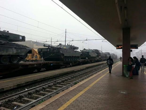 ROMA – Foto di carri armati su un treno. Circolano su Facebook ma sanno di bufale o di allarmismi un po’ prematuri. Le due foto sono di treni che trasportano carri armati e l’ultima segnalazione le etichetta entrambe così: “Roma Tiburtina”. Sembrano invece due stazioni differenti e anche i carri armati non sembrano gli stessi.