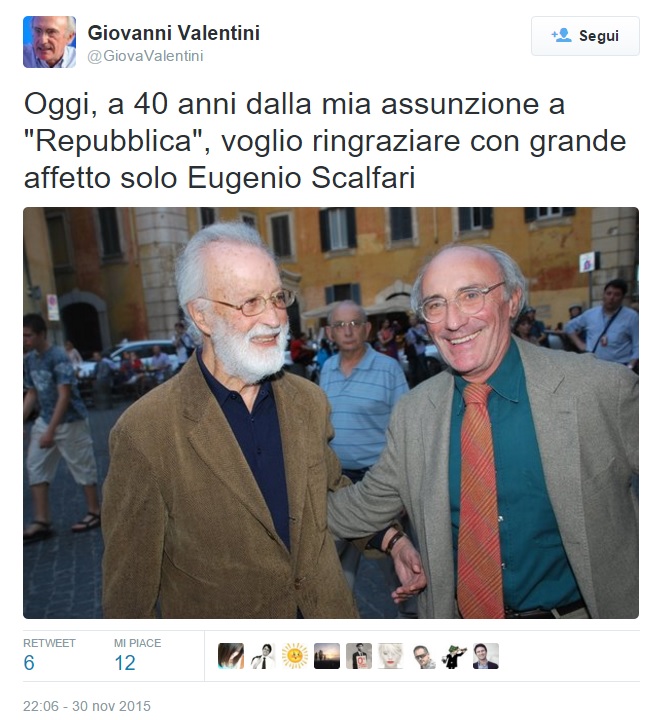 ROMA – Giovanni Valentini stacca il cordone ombelicale con Repubblica, un cordone lungo 40 anni, come lo stesso Valentini ricorda in un messaggio affiato a Twitter alle 6 e 04 di martedì mattina, 1 dicembre 2015: