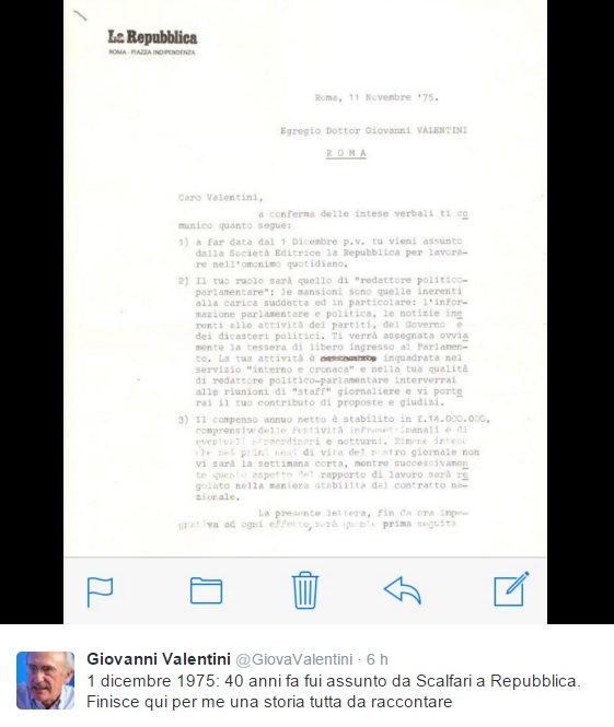 1 dicembre 1975: 40 anni fa fui assunto da Scalfari a Repubblica. Finisce qui per me una storia tutta da raccontare pic.twitter.com/FQWEiPiDXs”