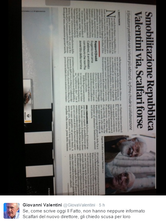 2. “Se, come scrive oggi Il Fatto, non hanno neppure informato Scalfari del nuovo direttore, gli chiedo scusa per loro”.