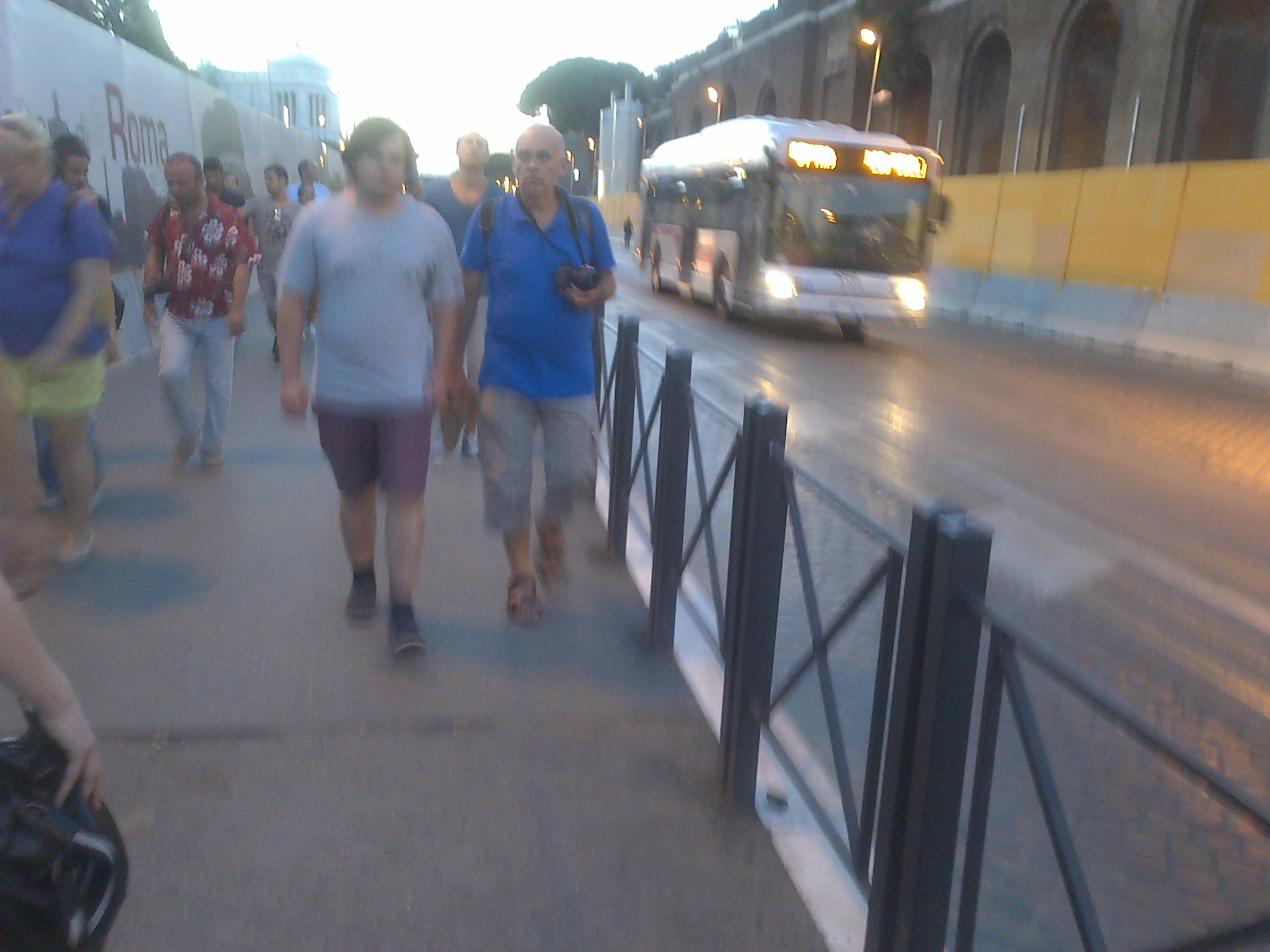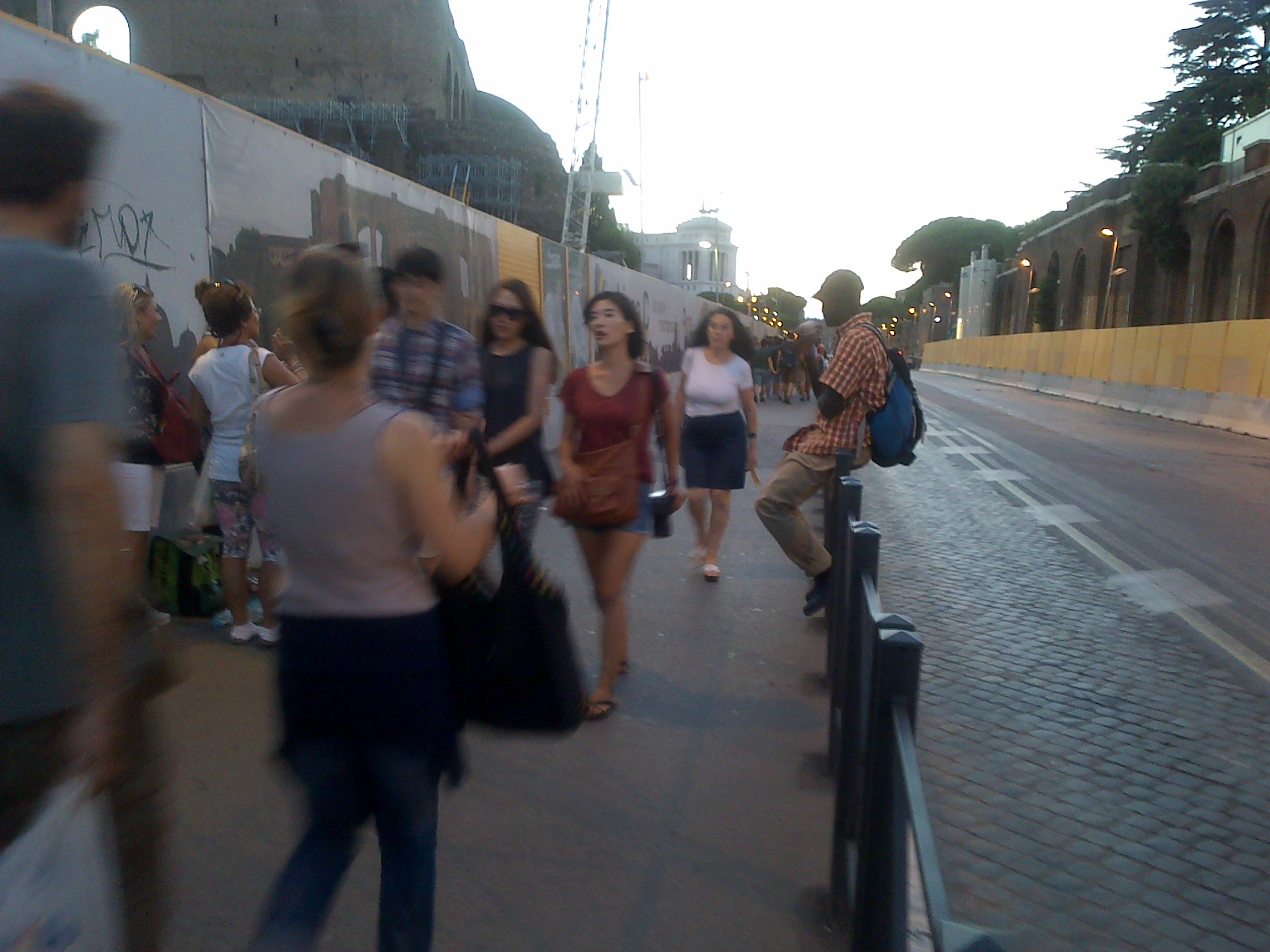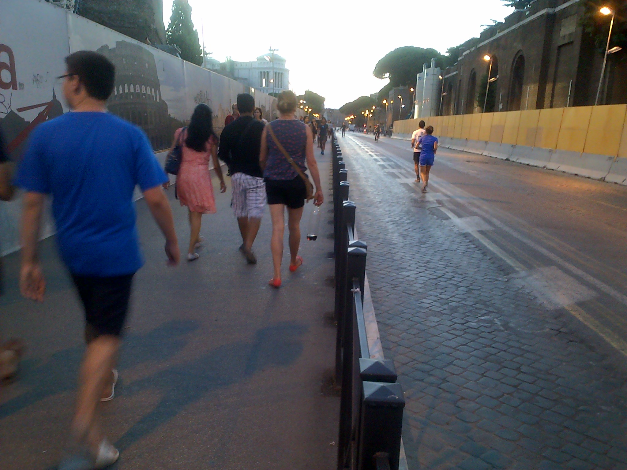 ROMA – La chiusura di via dei Fori Imperiali al traffico delle auto private, venduta come pedonalizzazione dei Fori imperiali, si sta rivelando una burla. Basta guardare le foto, scattate in via dei Fori Imperiali, alle 20 di mercoledì 27 agosto 2014, per rendersene conto: i pedoni non sono così liberi e felici come la propaganda del Comune di Roma, basandosi su interviste turisti più o meno probabili, vuole fare credere.