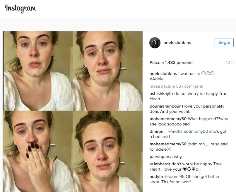 PHOENIX – Adele appare in un video senza trucco e raffreddata. Le immagini sono state pubblicate all’interno del suo profilo Instagram con l’intento di mostrare ai fan il motivo per cui il concerto di Phoenix è stato annullato: Adele è molto raffreddata e non è in grado, in queste ore, di salire su un palco.