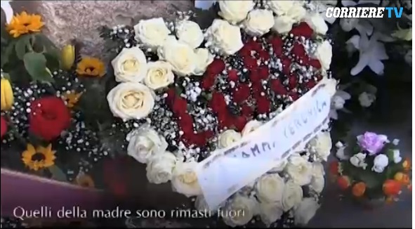 Tanti i fiori e i messaggi di affetto per questo bimbo di 8 anni brutalmente ucciso. Ma mentre i fiori di Davide, il papà , e del fratellino hanno accompagnato la bara, quelli di mamma Veronica, un cuscino di rose rosse e bianche, è stato lasciato fuori dalla chiesa mentre il feretro del bimbo veniva portato al cimitero.