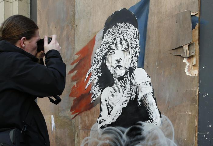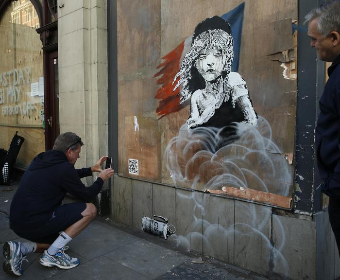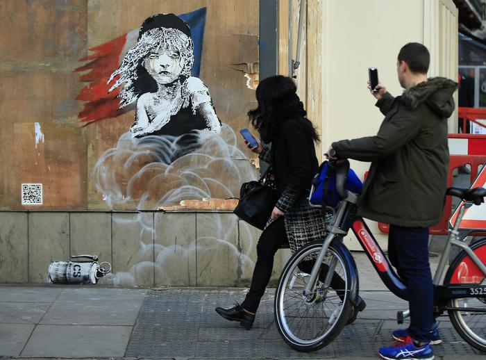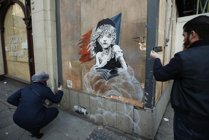 A man takes a photo of a new artwork by British artist Banksy opposite the French Embassy, in London, Monday, Jan. 25, 2016. The artwork depicts the young girl from the musical Les Miserables with tears streaming from her eyes as a can of CS gas lies beneath her. The work is criticising the use of teargas in the refugee camp in Calais. (ANSA/AP Photo/Alastair Grant)