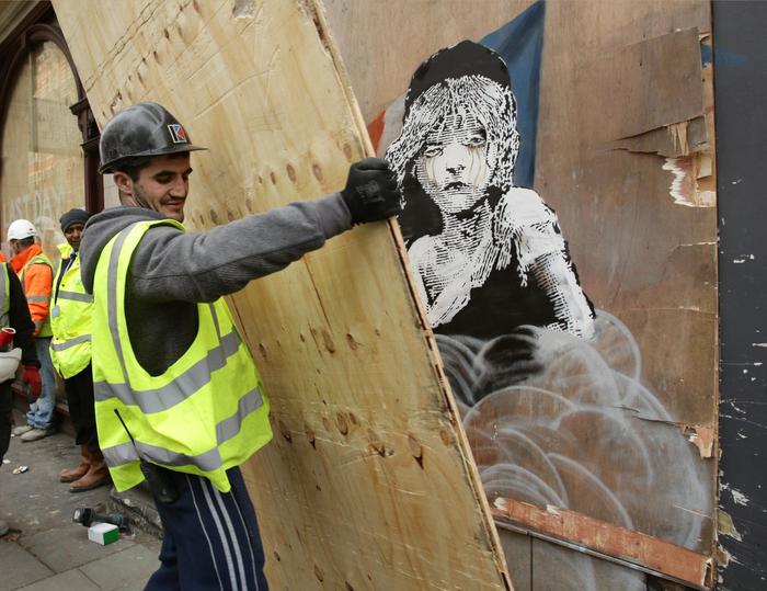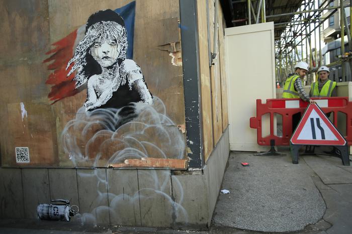 L’ultima opera di street art di bansky è stata infatti già ‘oscurata’ con un pannello. Il tema è il musical tratto dal capolavoro di Victor Hugo ‘Les Misérables’: una giovane donna, ispirata al celebre romanzo, con le lacrime agli occhi a causa dei gas lacrimogeni. Alle sue spalle una bandiera francese e a terra una bomboletta. Sulla sinistra, in basso, c’è un codice QR che rimanda a un video dell’operazione di sgombero del 5 gennaio scorso al campo profughi di Calais, dove erano stati impiegati lacrimogeni e proiettili di gomma.