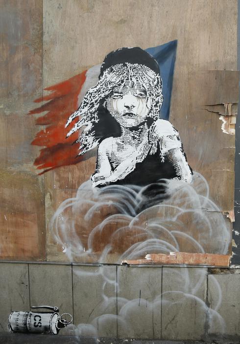 A new artwork by British artist Banksy opposite the French Embassy, in London, Monday, Jan. 25, 2016. The artwork depicts the young girl from the musical Les Miserables with tears streaming from her eyes as a can of CS gas lies beneath her. The work is criticising the use of teargas in the refugee camp in Calais. (ANSA/AP Photo/Alastair Grant)
