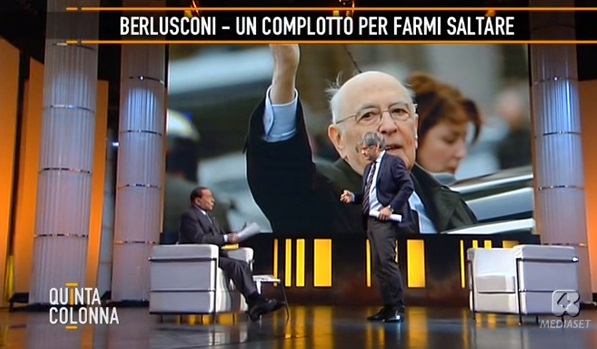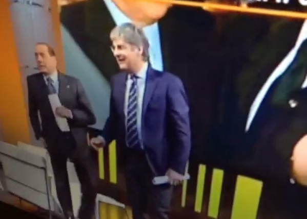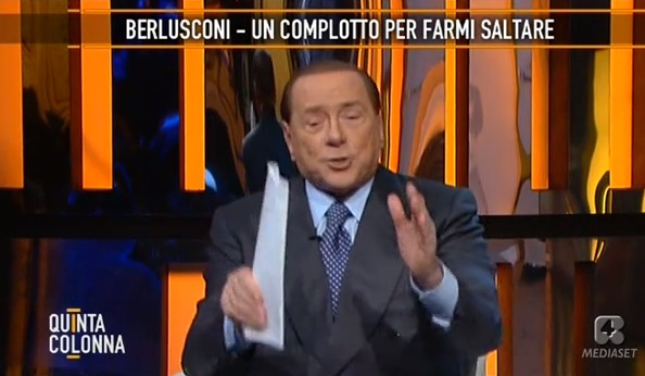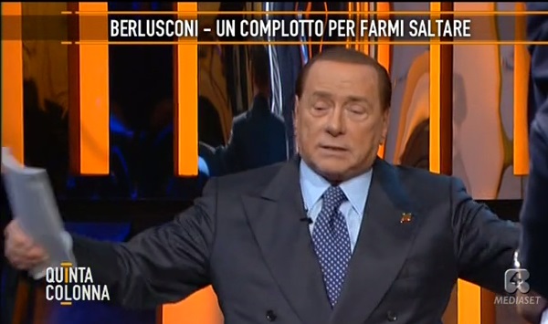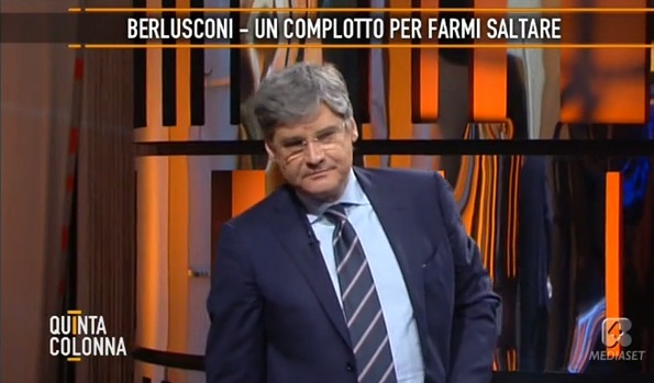 ROMA – Il siparietto è andato in scena ieri sera, 19 maggio, su Quinta Colonna: Berlusconi, ospite su Rete 4, parla di complotti, di elezioni ma rischia di fare tardi, di non rispettare le restrizioni dovute all’affidamento ai servizi sociali che gli impongono di rientrare al suo domicilio entro le 23. Del Debbio allora cerca di interrompere Berlusconi, si avvicina e alla fine lo costringe a interrompere il discorso.