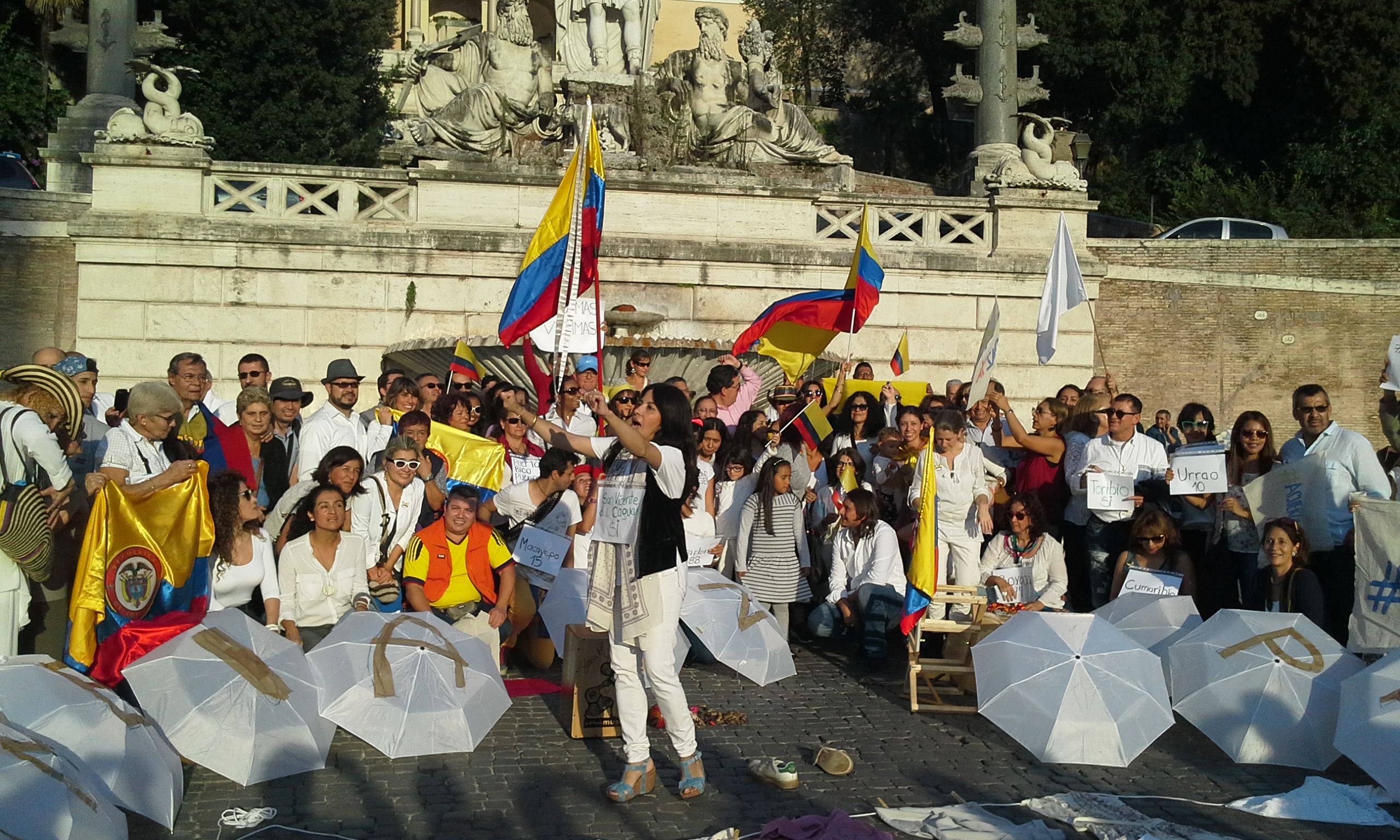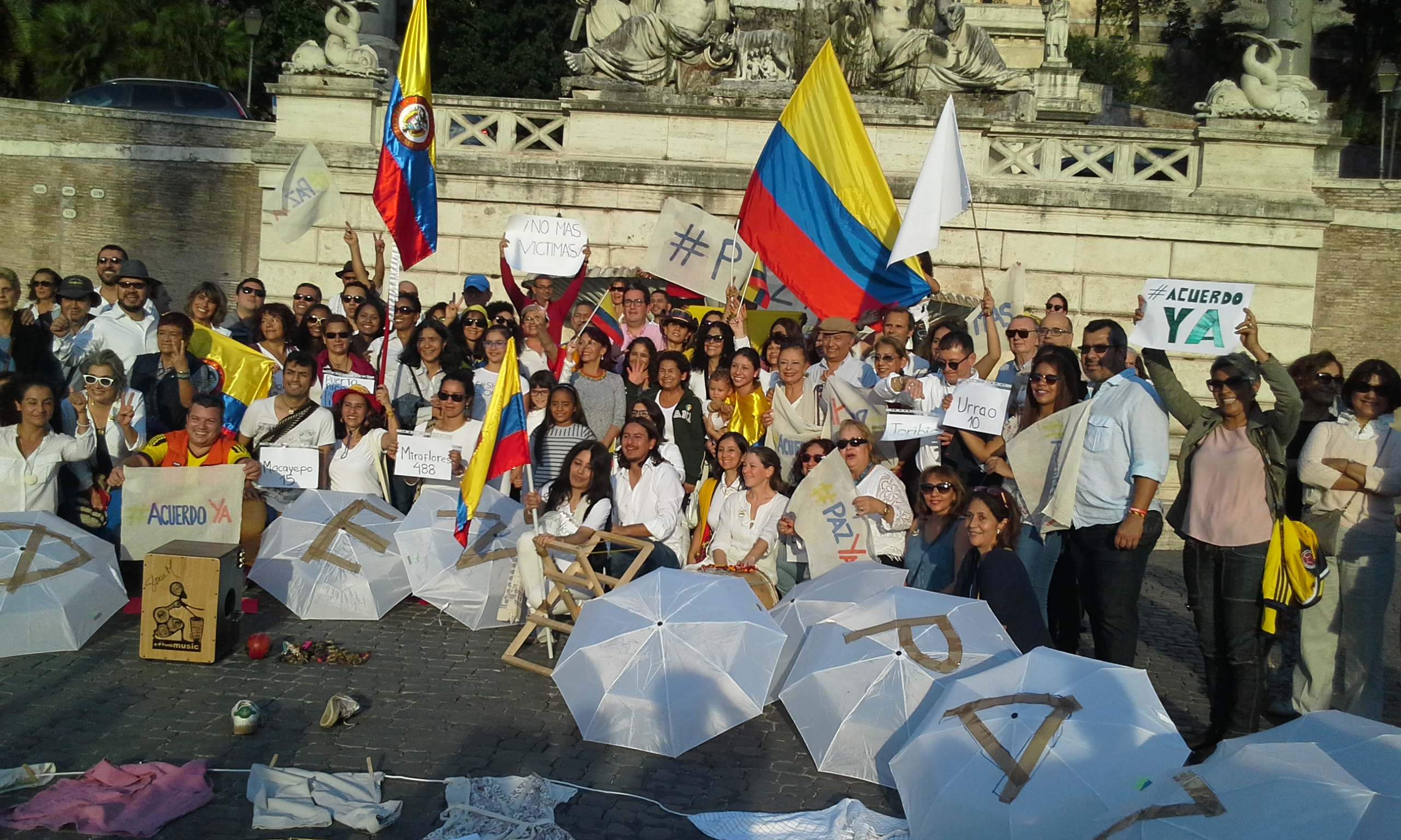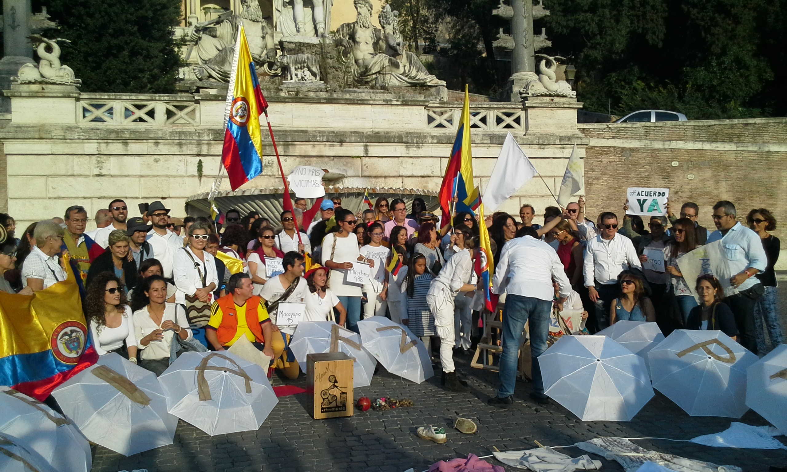Le persone in piazza hanno sfilato vestite di bianco, intorno ad un cerchio formato da bandierine gialle, rosse e blu, raffiguranti i colori della Colombia. Hanno urlato lo slogan “guerra nunca mas” e “paz y acuerdo ya” (“guerra mai più” e “pace e accordo subito” ndr). Oltre ai vestiti, anche gli ombrelli erano bianchi, il colore della pace, con su scritto una lettera diversa, per formare tutti insieme la scritta “paz en Colombia”.