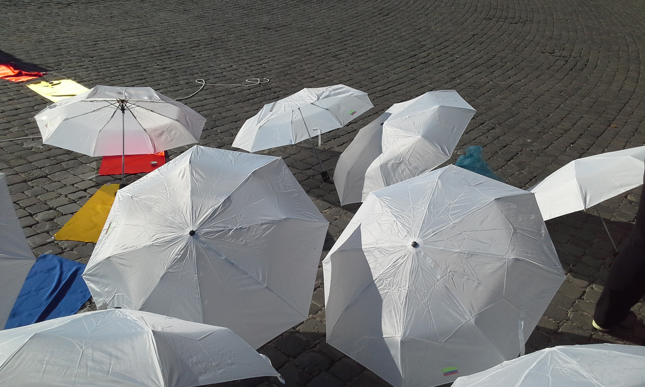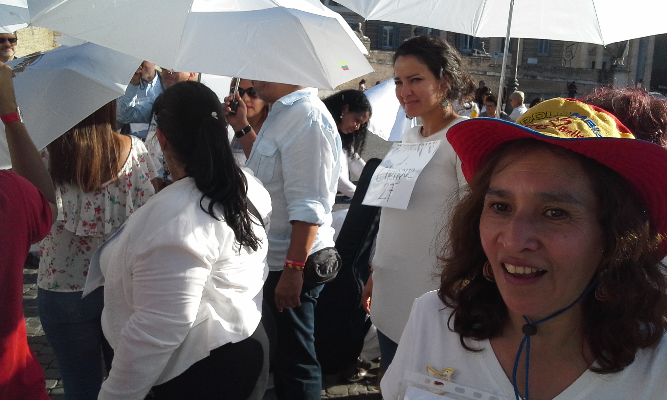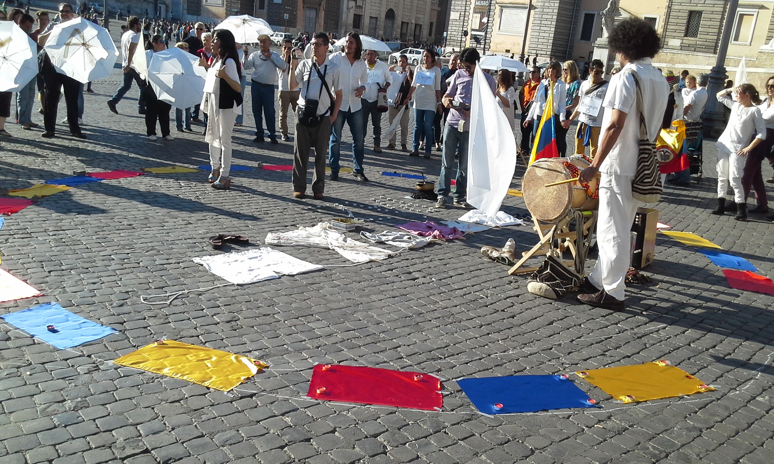 Le persone in piazza hanno sfilato vestite di bianco, intorno ad un cerchio formato da bandierine gialle, rosse e blu, raffiguranti i colori della Colombia. Hanno urlato lo slogan “guerra nunca mas” e “paz y acuerdo ya” (“guerra mai più” e “pace e accordo subito” ndr). Oltre ai vestiti, anche gli ombrelli erano bianchi, il colore della pace, con su scritto una lettera diversa, per formare tutti insieme la scritta “paz en Colombia”.