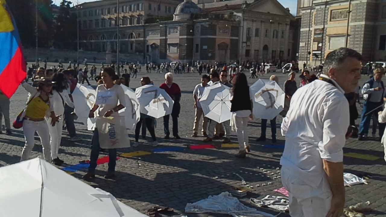 ROMA – Un gruppo di colombiani che vive a Roma, domenica 16 ottobre ha organizzato nella centralissima piazza del Popolo un flash mob per chiedere la pace. L’iniziativa è stata decisa dopo la bocciatura del referendum che ha respinto gli accordi tra governo e guerriglieri della Farc, le Forze Armate Rivoluzionarie della Colombia.