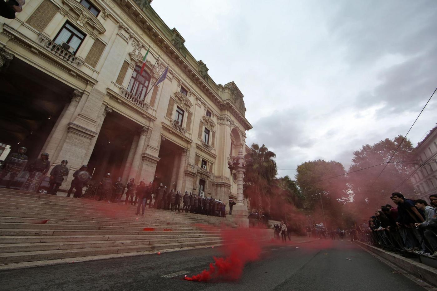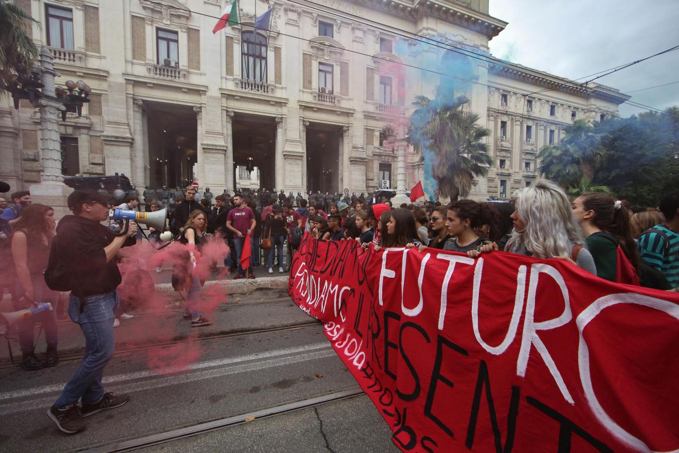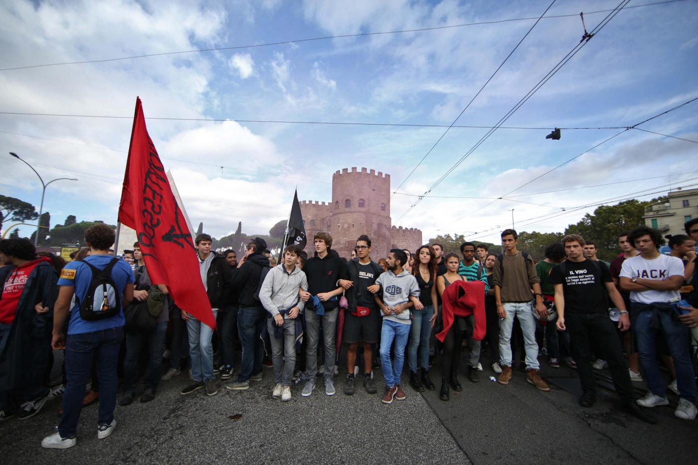 ROMA – Gli studenti di Roma che la mattina del 2 ottobre hanno manifestato dalla Piramide al ministero della Pubblica istruzione hanno spiegato, ai piedi dell’edificio di viale Trastevere, le loro ragioni al microfono. “Giannini dove sei? – hanno detto rivolti al palazzo del ministro – Non c’è nessuno, nessun confronto. Noi vogliamo risolvere le cose insieme ma loro non ci sono. La buona scuola è buona solo per i padroni”. Alcuni hanno acceso fumogeni rossi e azzurri, scandendo cori come “La scuola é pubblica e non si tocca, la difenderemo con la lotta”, e slogan contro il prefetto di Roma Franco Gabrielli. Gli studenti hanno inoltre esposto uno striscione a favore degli immigrati: ‘Nostra patria è il mondo intero. Welcome refugees’. Dal microfono é stato dato appuntamento alle prossime manifestazioni, a partire da quella di questo pomeriggio alle 17, che dal Colosseo raggiungerà la Prefettura. Il corteo é stato infine dichiarato sciolto.