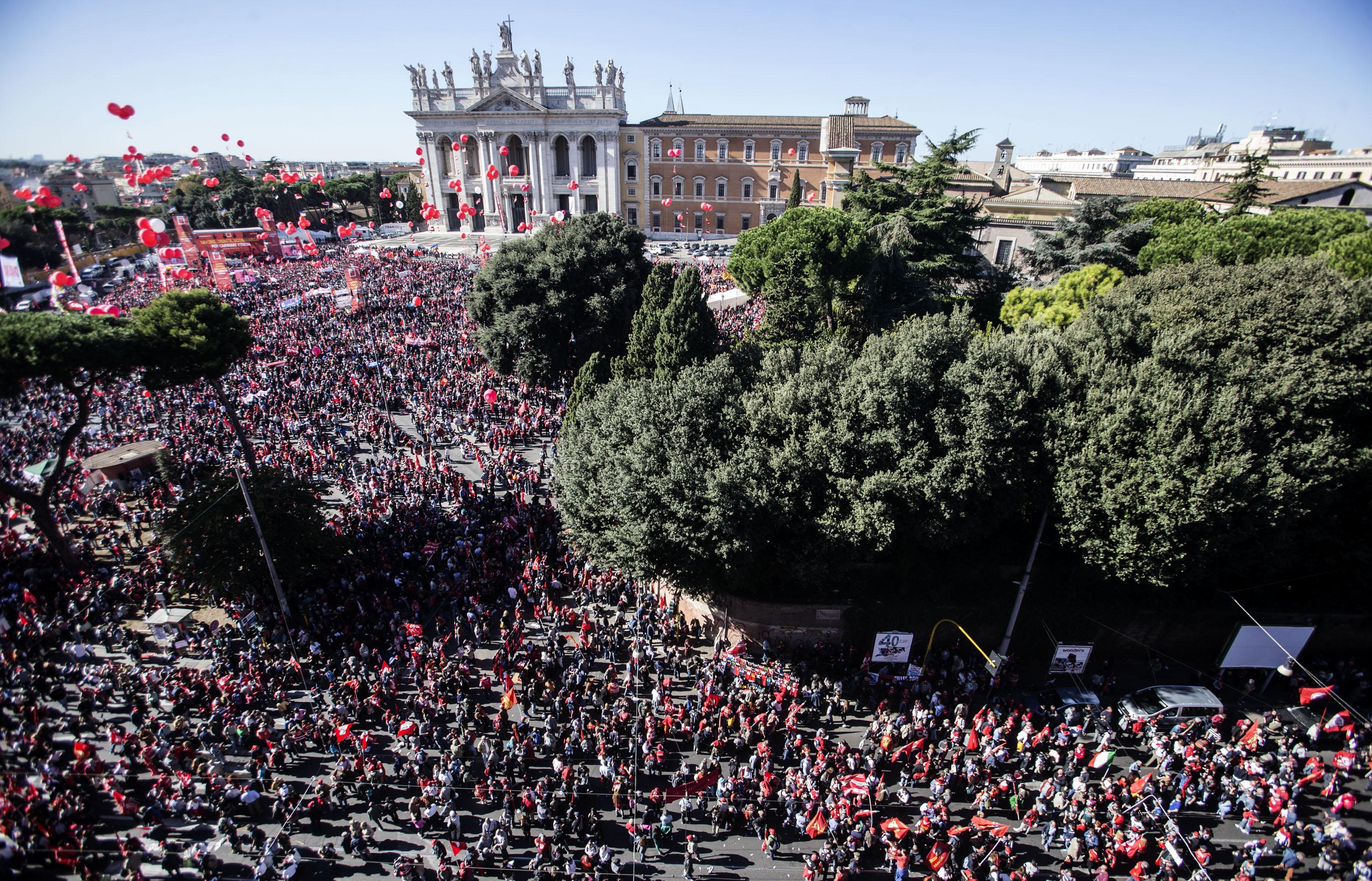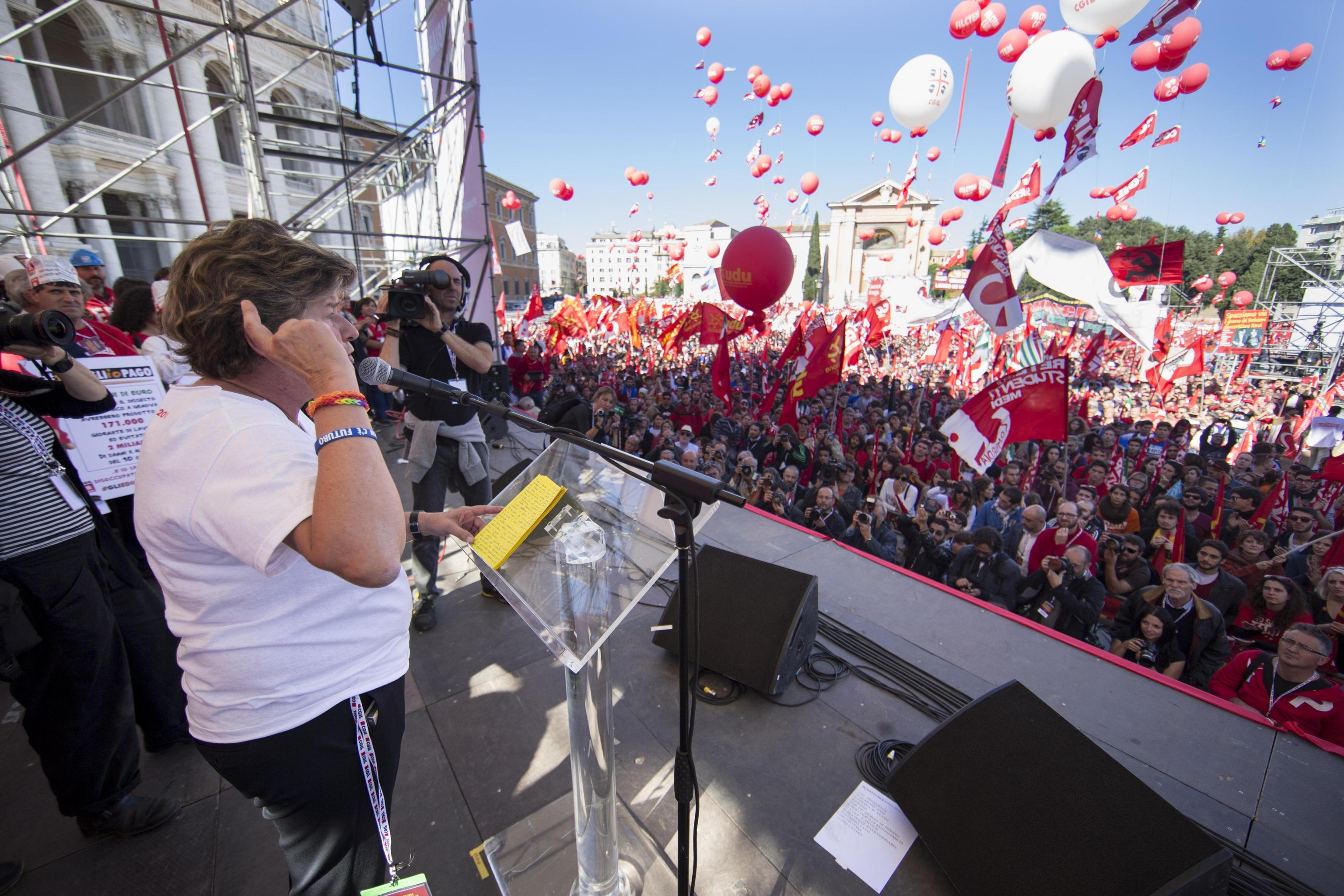 ROMA – “Avanti con lo sciopero generale”, dice il leader della Cgil Susanna Camusso. E’ la giornata del maxi corteo Cgil. A Roma, piazza San Giovanni, ci sono circa un milione di persone arrivate da tutta Italia. Un corteo “classico” iniziato con la marcia, continuato con il discorso della Camusso e l’annuncio dello sciopero, finito poco dopo le 14 con i manifestanti che si salutano cantando “Bella ciao”