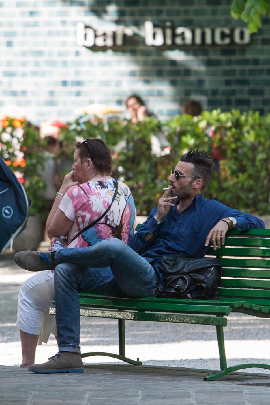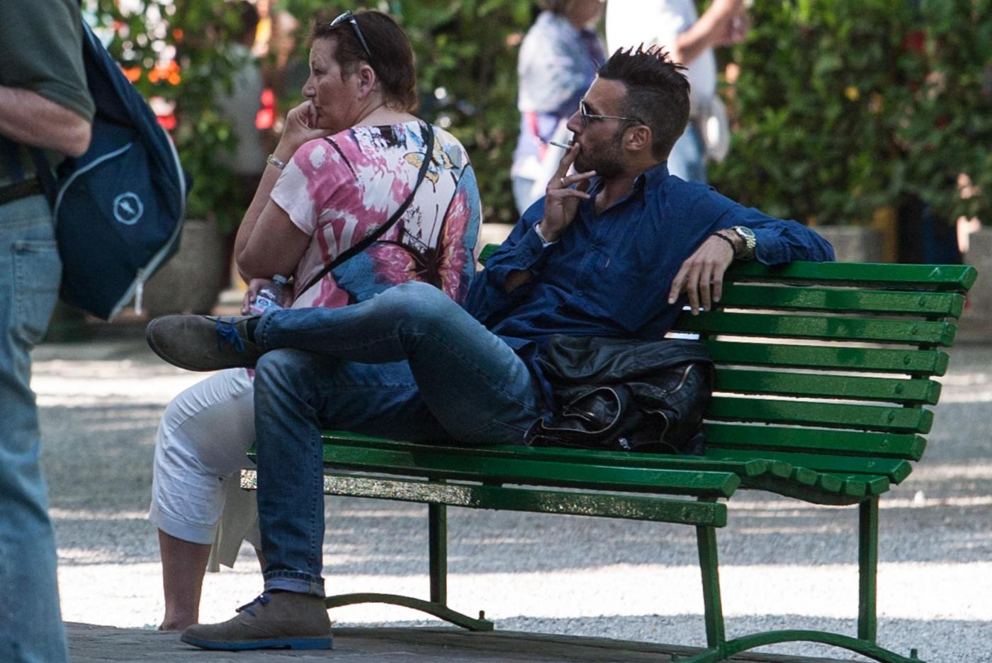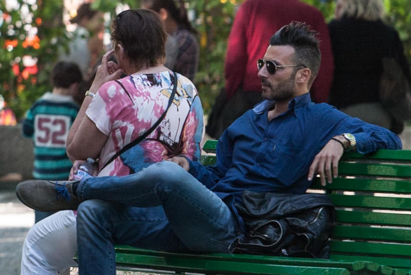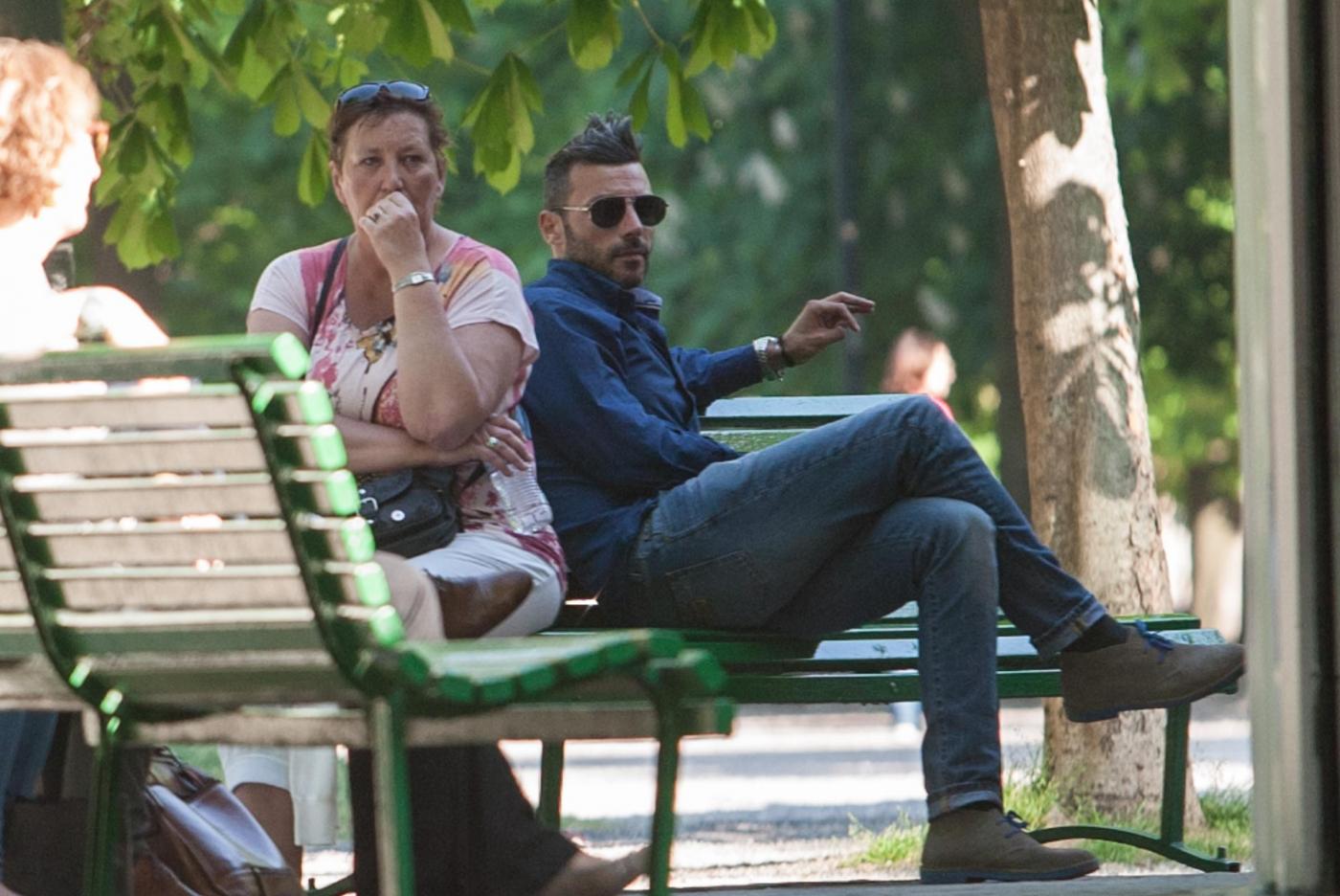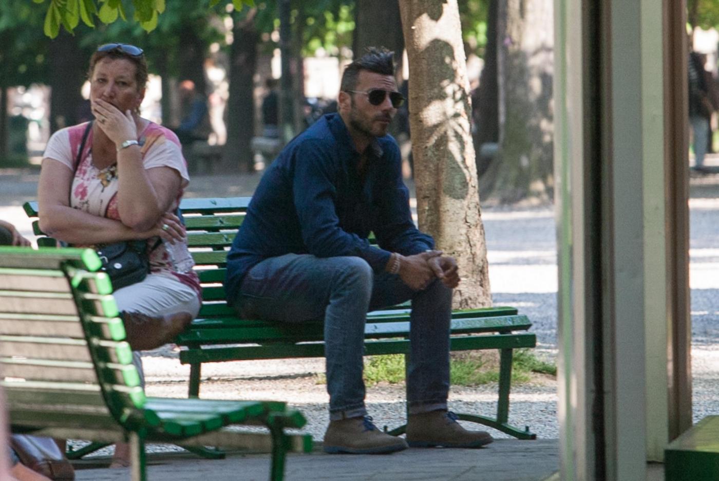MILANO – Daniele Interrante in versione papà. Attore e personaggio televisivo, lontano dagli schermi Daniele non rinuncia a un tocco fashion: occhialoni da sole, camicia blu impeccabile, atteggiamento da divo mentre sta seduto sulla panchina ai giardinetti pubblici Indro Montanelli di Milano ad osservare