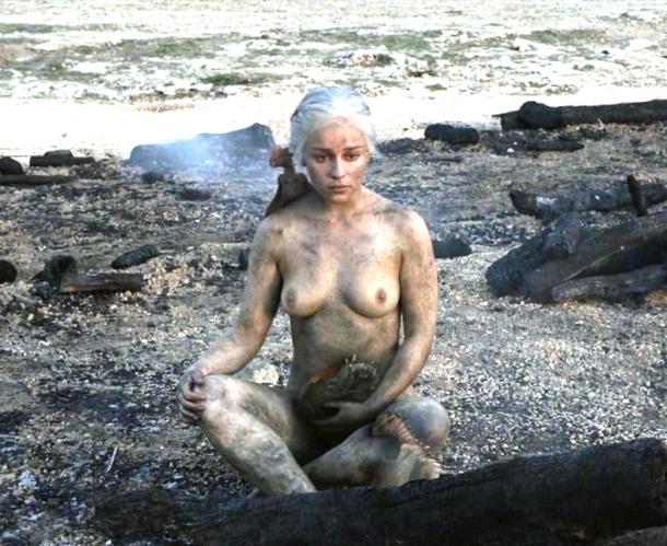 Emilia Clarke ha raccontato che per poter girare quella scena ripresa dal Secolo XIX ha dovuto bere della vodka. L’attrice aveva firmato con la produzione una clausola di non-nudità: per questa ragione, dalla prima stagione in poi, il pubblico non l’aveva vista senza veli. La decisione però di girare ugualmente quella scena, ha spiegato la Clarke che è dipeso dal fatto che, se la nudità è funzionale alla storia, va benissimo spogliarsi. In questo caso, riemergere dall’inferno dei Khal, unica sopravvissuta ai suoi mortali nemici, per l’attrice ha avuto senso mostrarsi nuda.