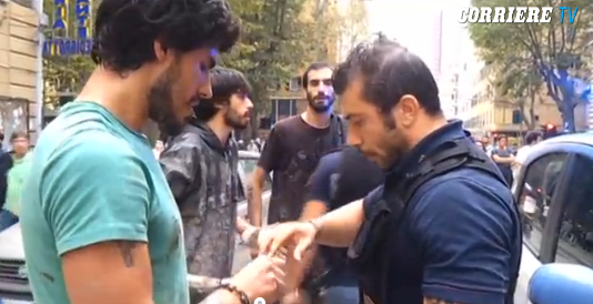 Gli agenti hanno chiesto i documenti ai giovani che li contestavano. I ragazzi hanno reagito dando i loro documenti e provando senza successo a chiedere le generalità agli agenti: “Sei un pubblico ufficiale” ha detto uno degli angeli del fango ad uno dei poliziotti.