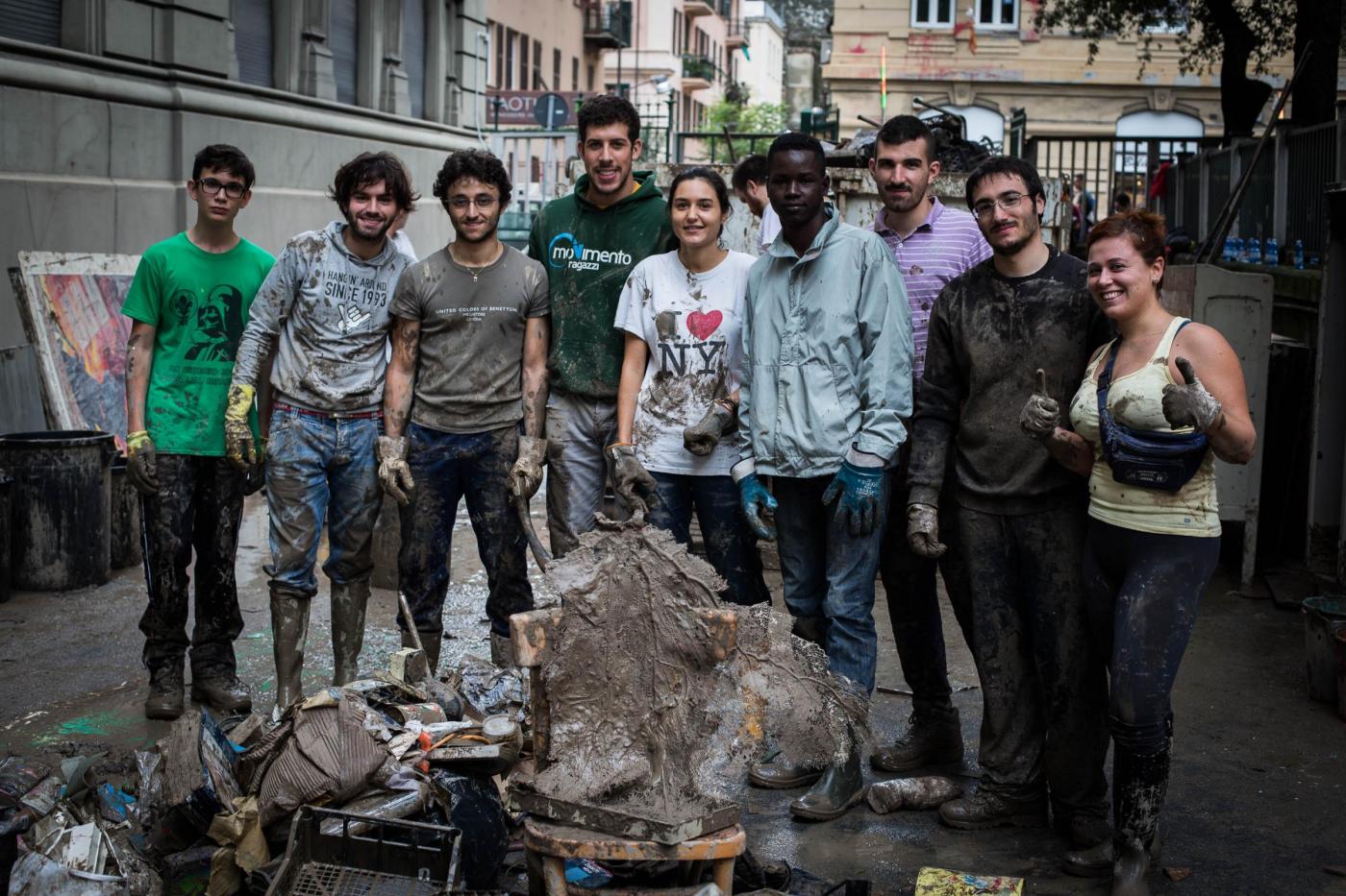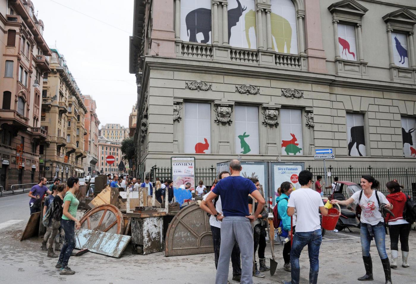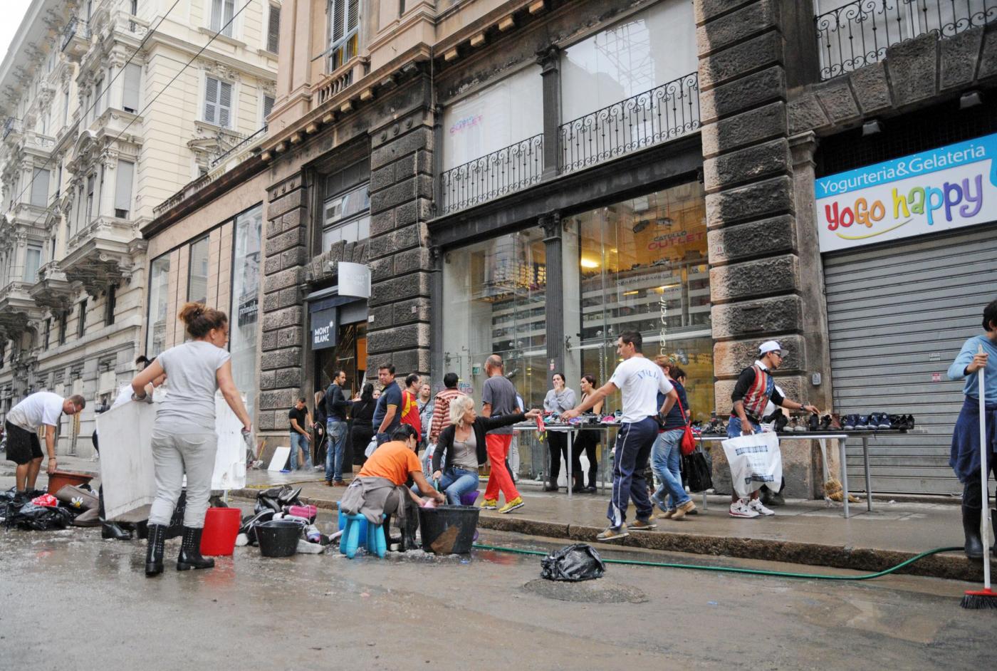 Gli angeli del fango al lavoro ripuliscono negozi e strade a Genova (foto LaPresse)