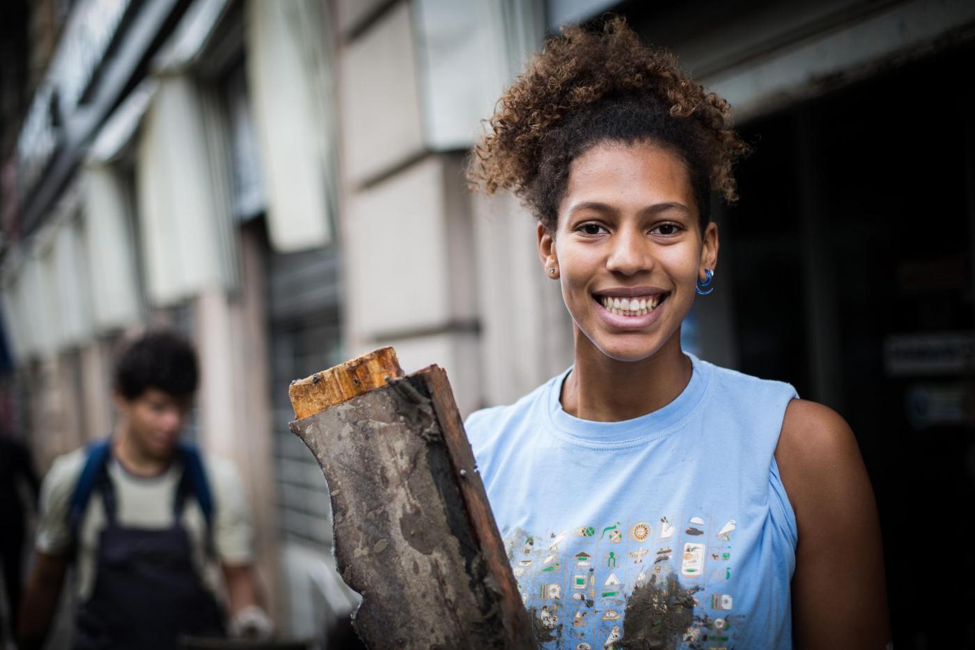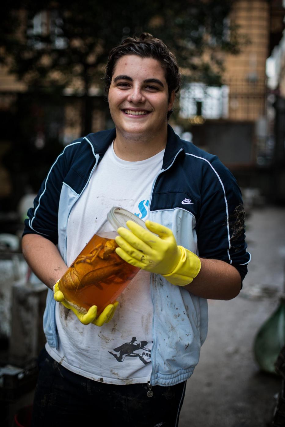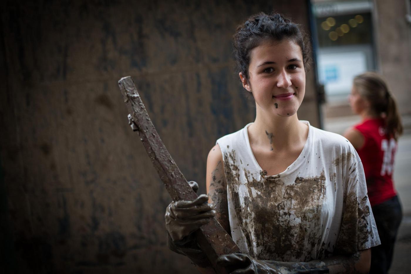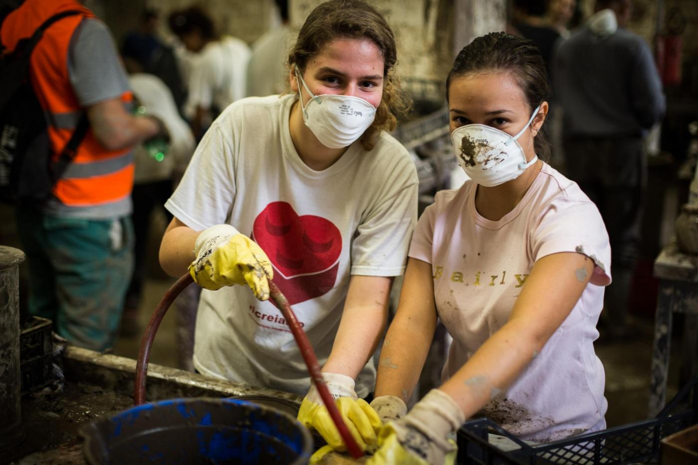 Gli angeli del fango al lavoro ripuliscono negozi e strade a Genova (foto LaPresse)