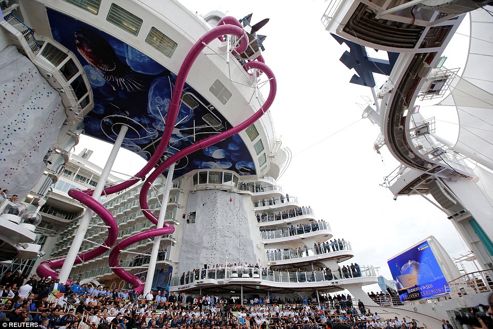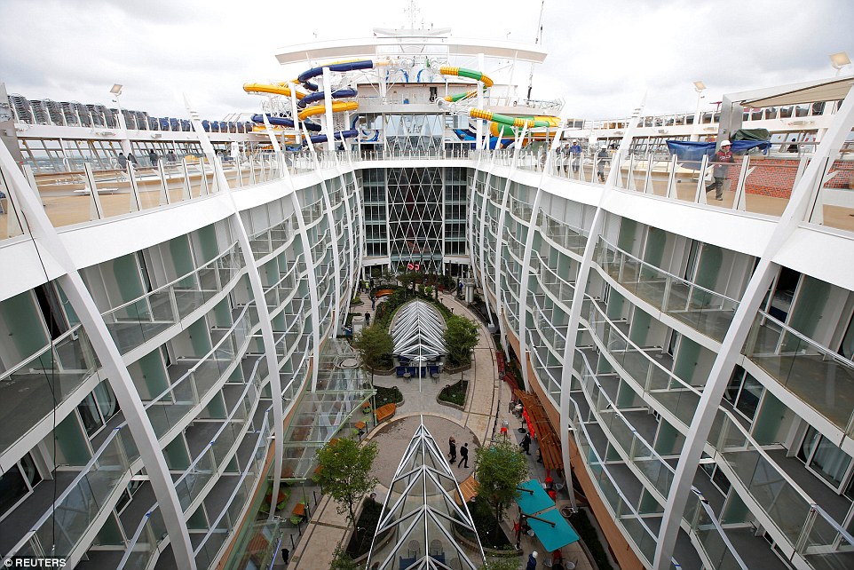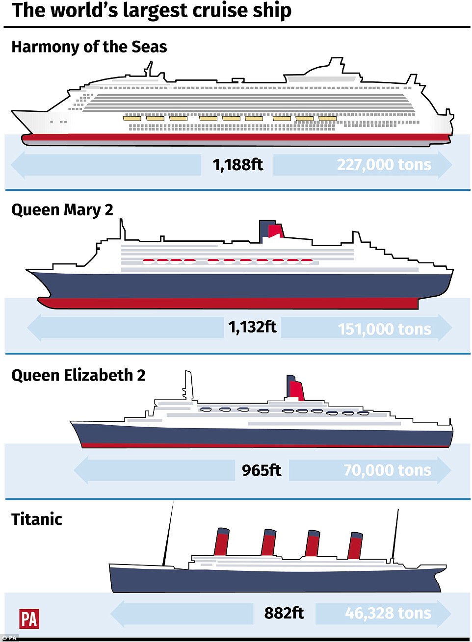 Con un equipaggio di 2.100 persone provenienti da 77 paesi, la città galleggiante vanta sette “quartieri”, 23 piscine, 20 luoghi di ristoro, 52 alberi, simulatori di surf, baristi robot, un casinò e pareti per l’arrampicata. A bordo dell’Harmony of the Seas – lunga 362 metri, larga 66 metri e alta 72 metri – equivalente di un edificio di venti piani – Mark Palmer per il Daily Mail descrive la nave come la “più grande e innovativa che abbia mai visto. La poppa della nave è molto più alta dello Shard di Londra, della Tour Eiffel di Parigi e del lussuoso hotel Burj Al Arab di Dubai. E’ lunga 91 metri in più del Titanic e può trasportare 6.780 clienti e 2.100 persone dello staff”.