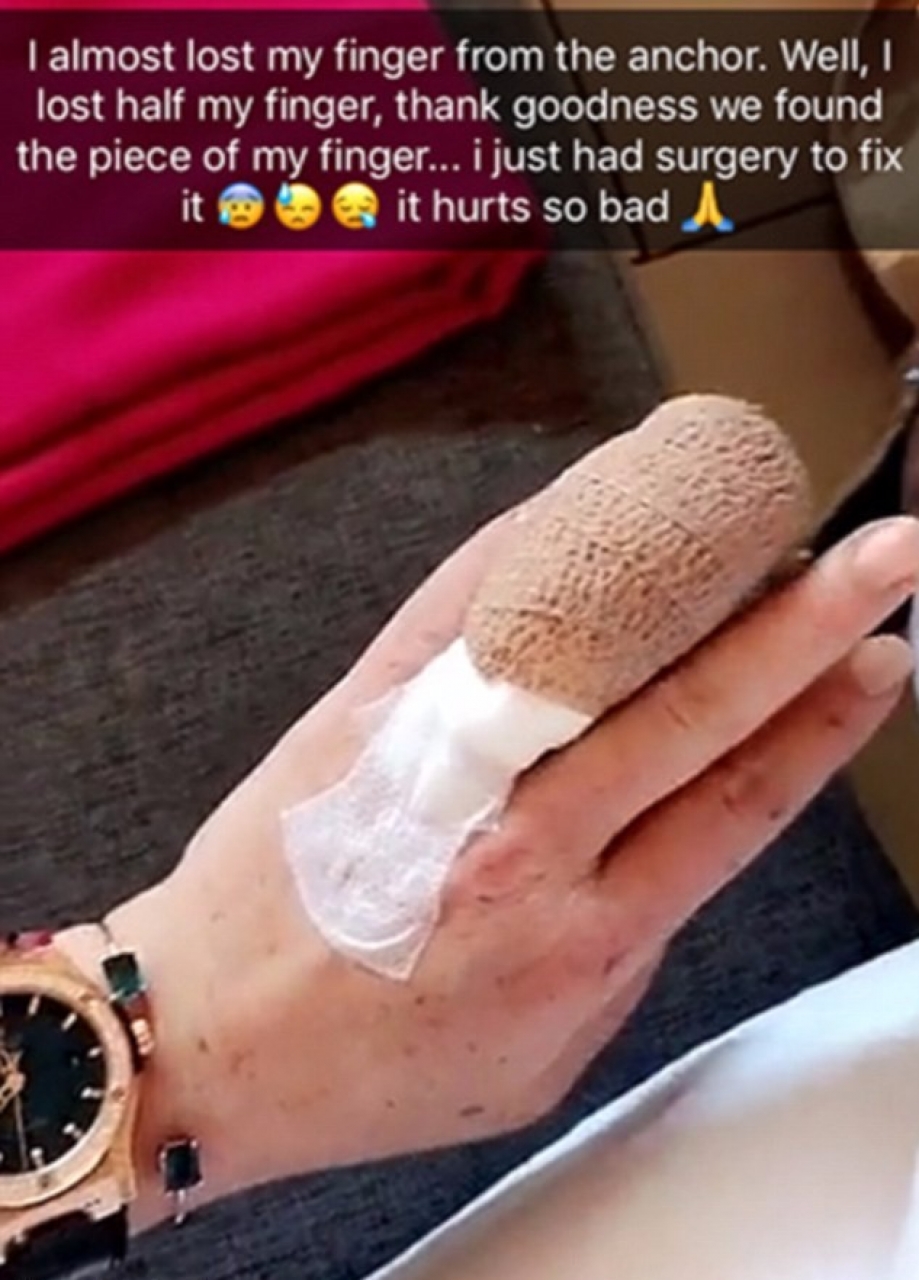 “Questo è il risultato per aver cercato di aiutare ad ancorare la barca. Il mio povero dito!”.