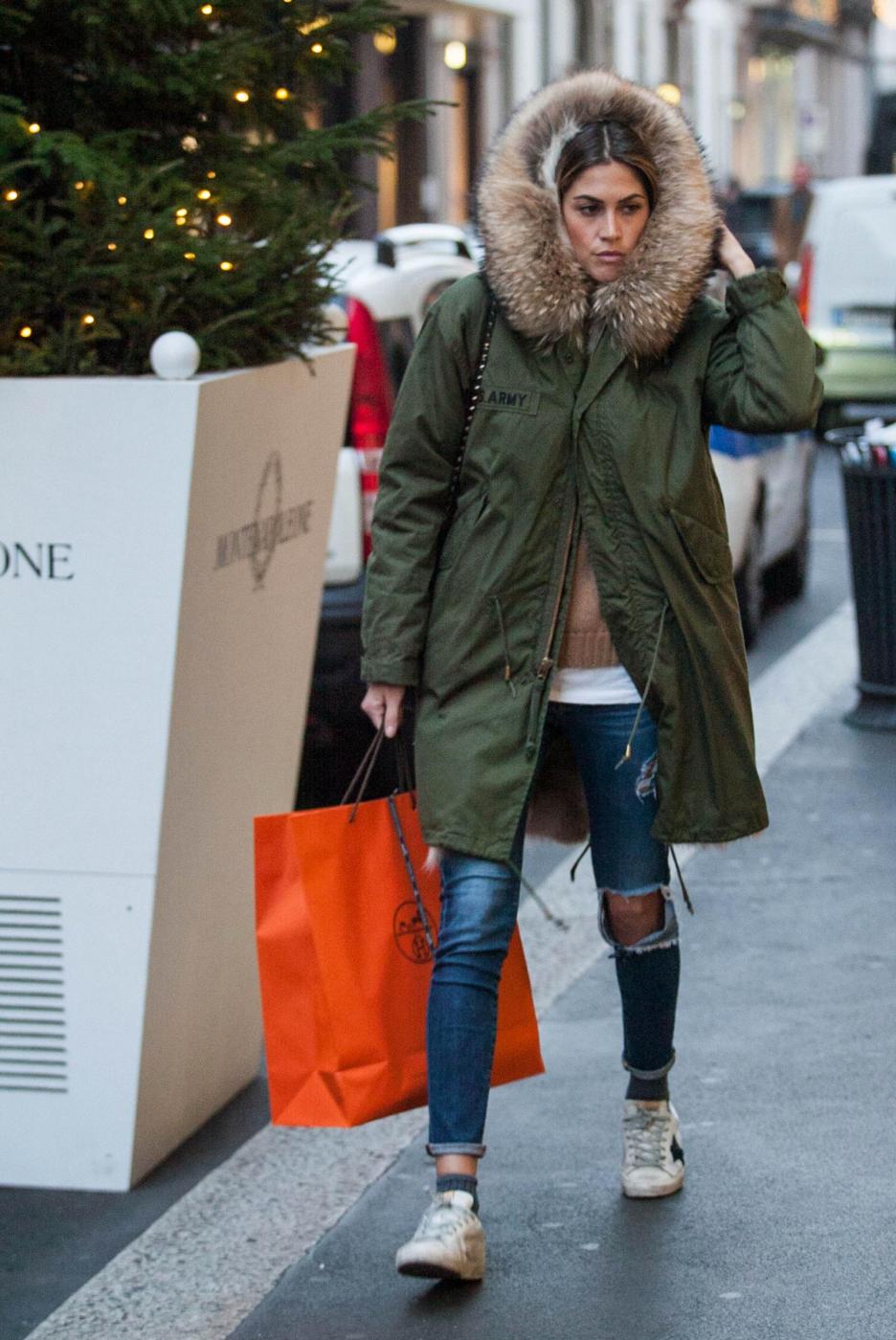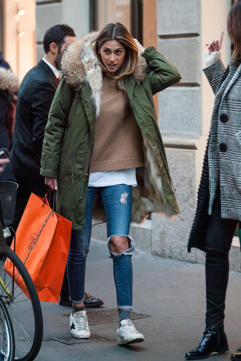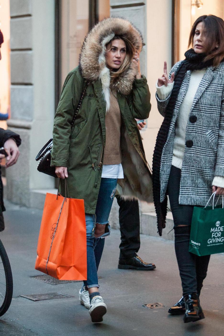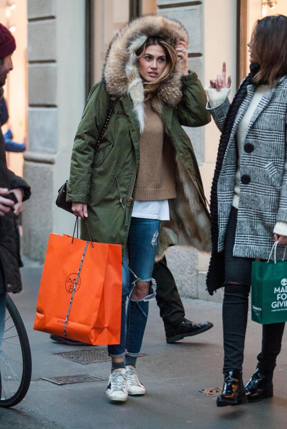 Melissa si ferma a lungo da Hermes e poi esce dalla boutique soddisfatta con un pacchetto. Accompagnata dall’amica Simona Slvemini, prova anche un paio di stivali da Bottega Veneta e poi guarda con attenzione le vetrine lungo il percorso.