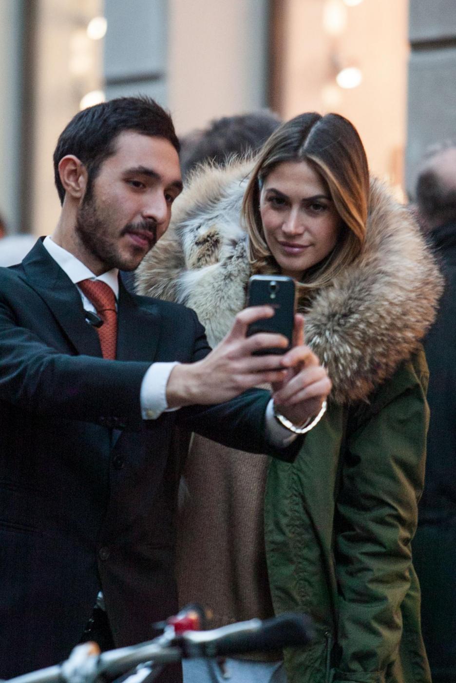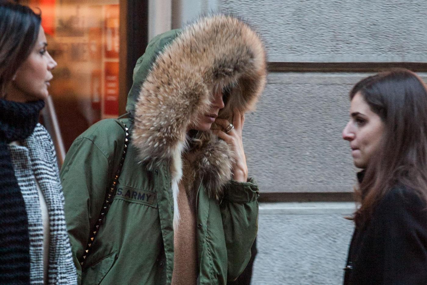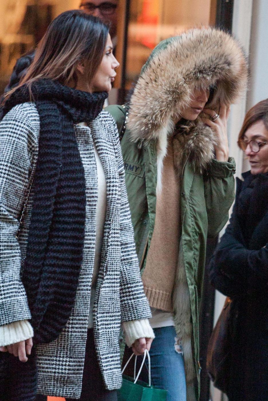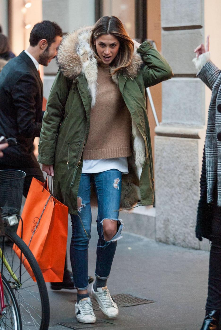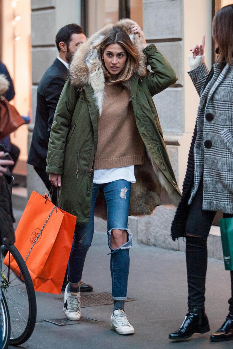Melissa si ferma a lungo da Hermes e poi esce dalla boutique soddisfatta con un pacchetto. Accompagnata dall’amica Simona Slvemini, prova anche un paio di stivali da Bottega Veneta e poi guarda con attenzione le vetrine lungo il percorso.