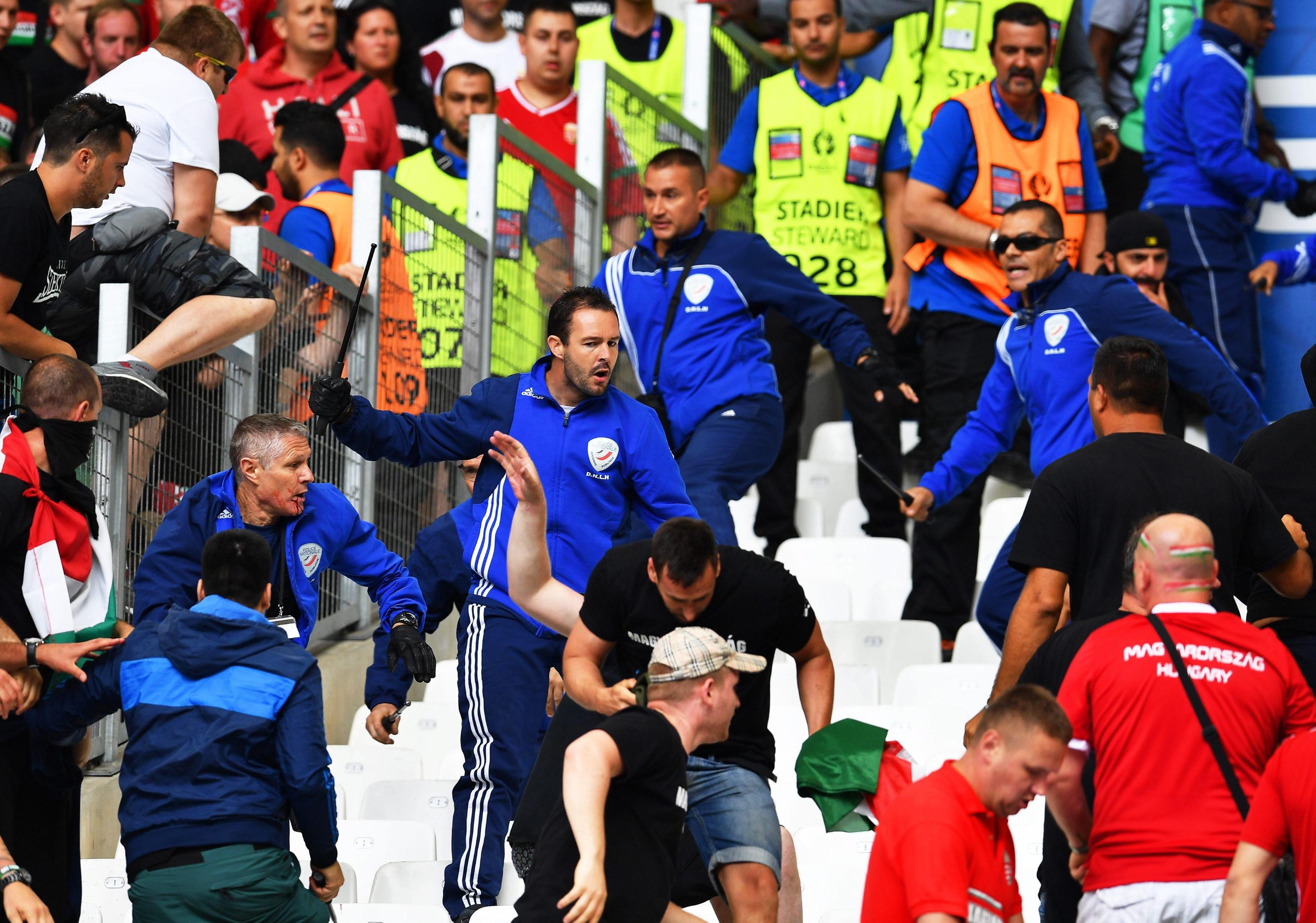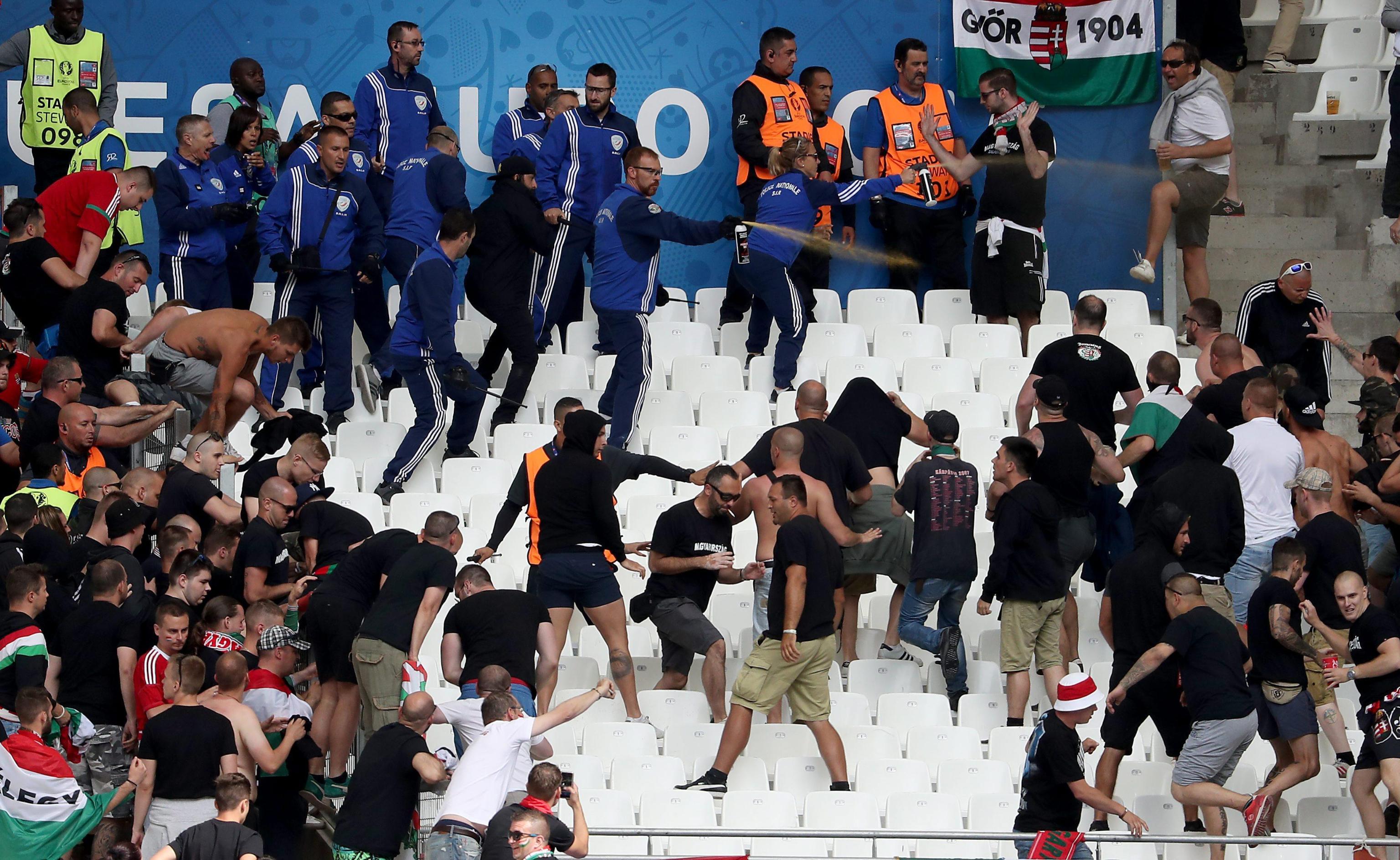 Hooligan ungherese EPA/PETER POWELL Scontri fra ungheresi e polizia francese EPA/ALI HAIDER Scontri fra ungheresi e polizia francese EPA/PETER POWELL Ungheresi sugli spalti del Velodrome di Marsiglia